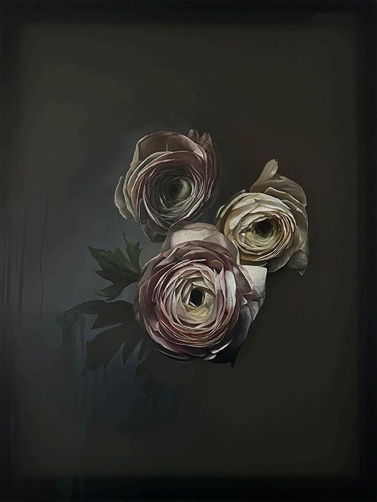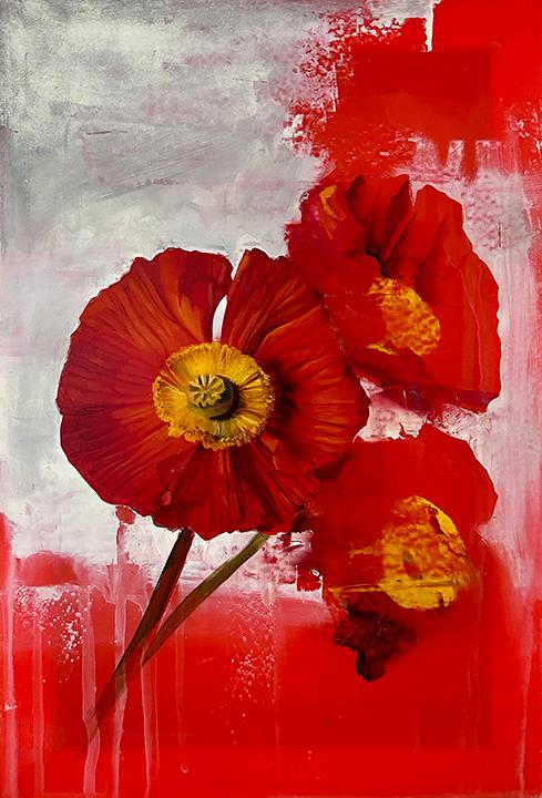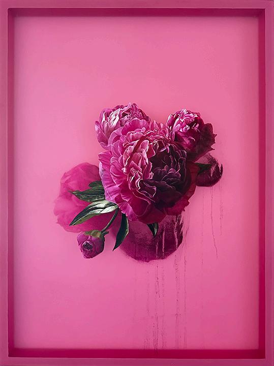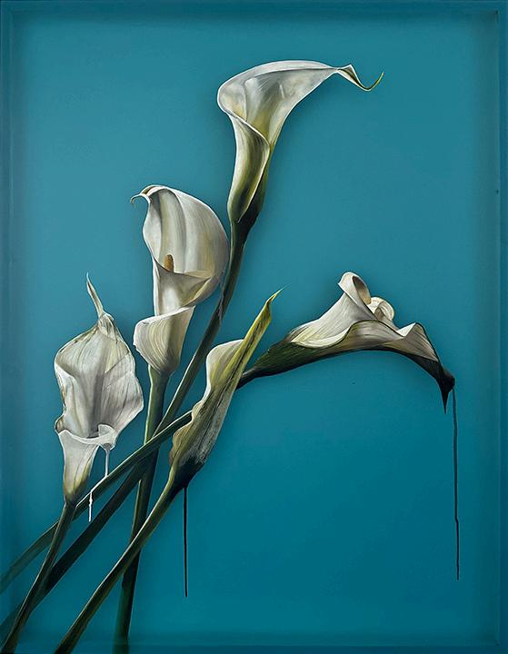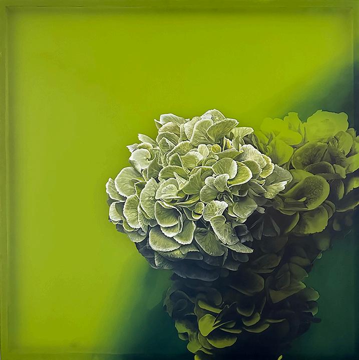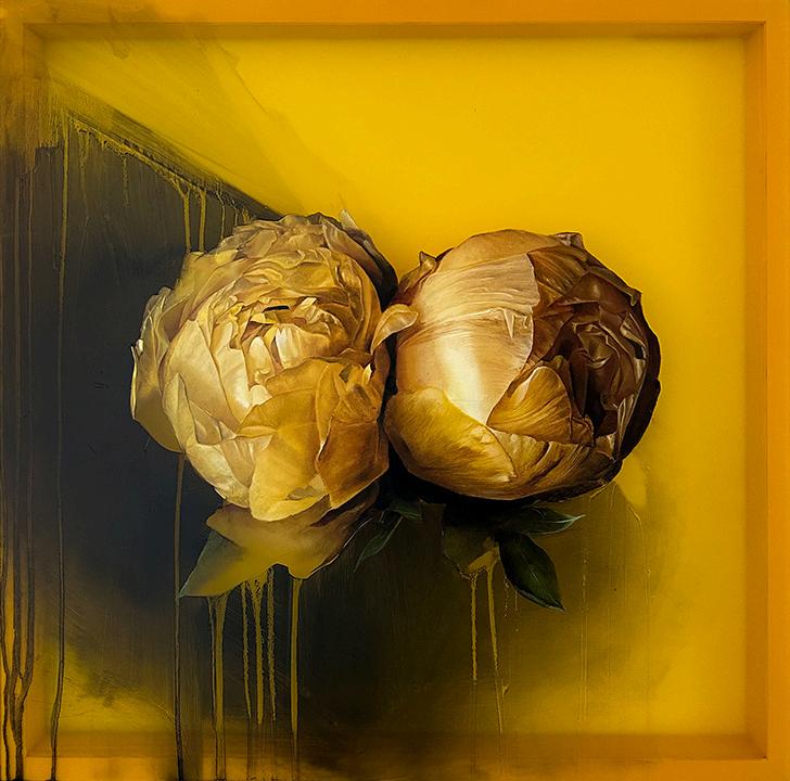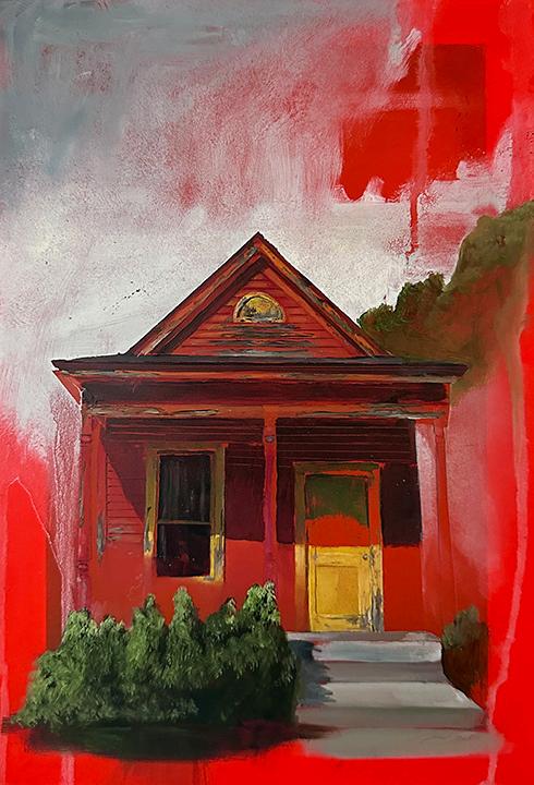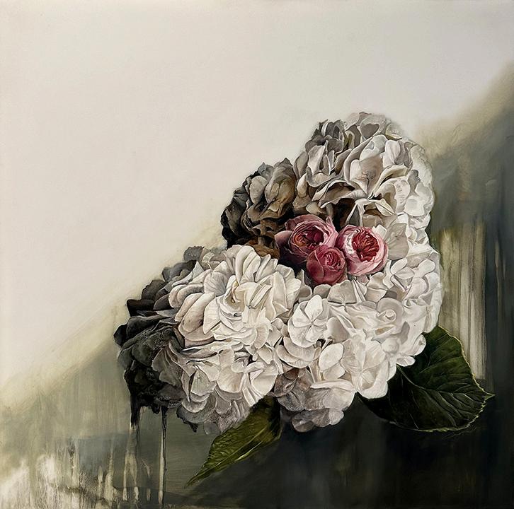 Incoming, Jared Small’s newest collection of paintings, delves into themes of impermanence and fragility with his signature photorealistic depictions. Presented in pairs, each work juxtaposes an aging, weathered house with a vibrant bouquet or single flower in the same color. The fresh, full-bloom florals stand in striking contrast to the slowly eroding bungalows, highlighting the fleeting nature of both manmade and natural beauty. Small’s hyperrealistic style enhances this dialogue, drawing the viewer into a poignant meditation on the passage of time.