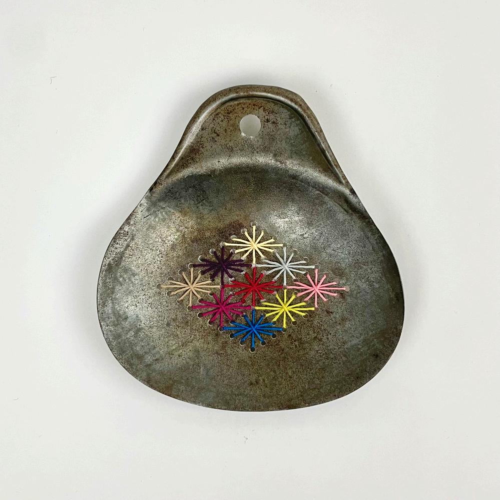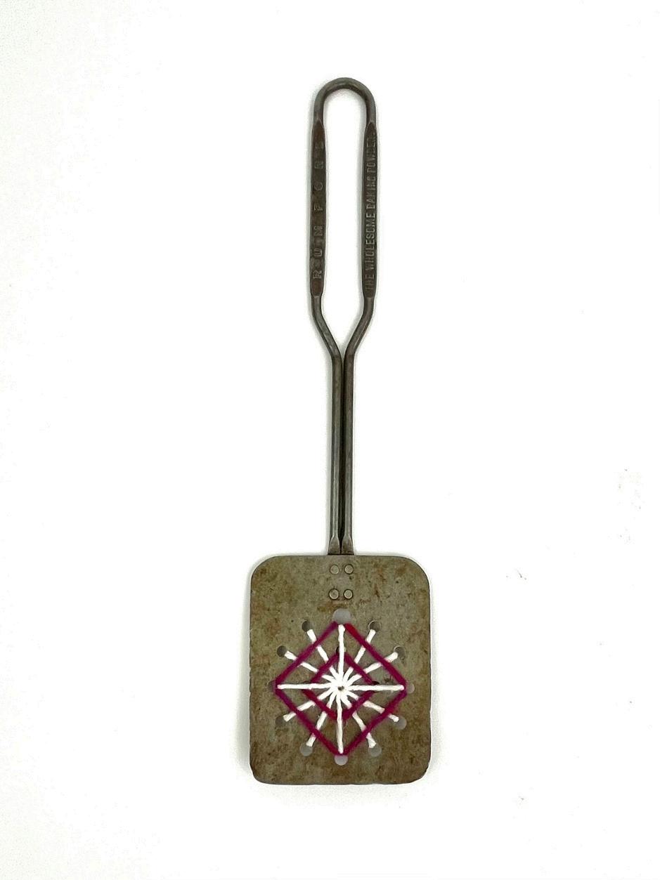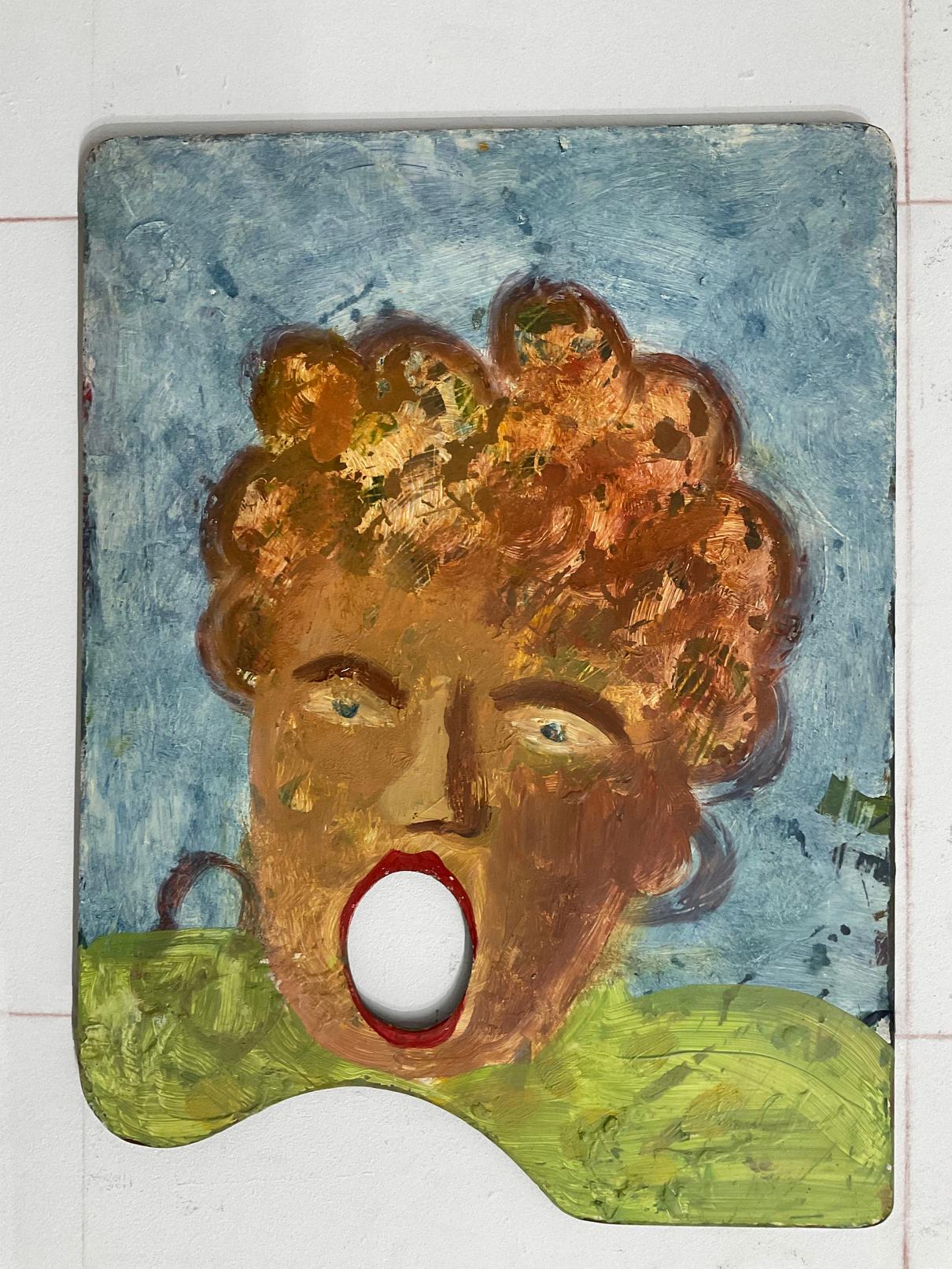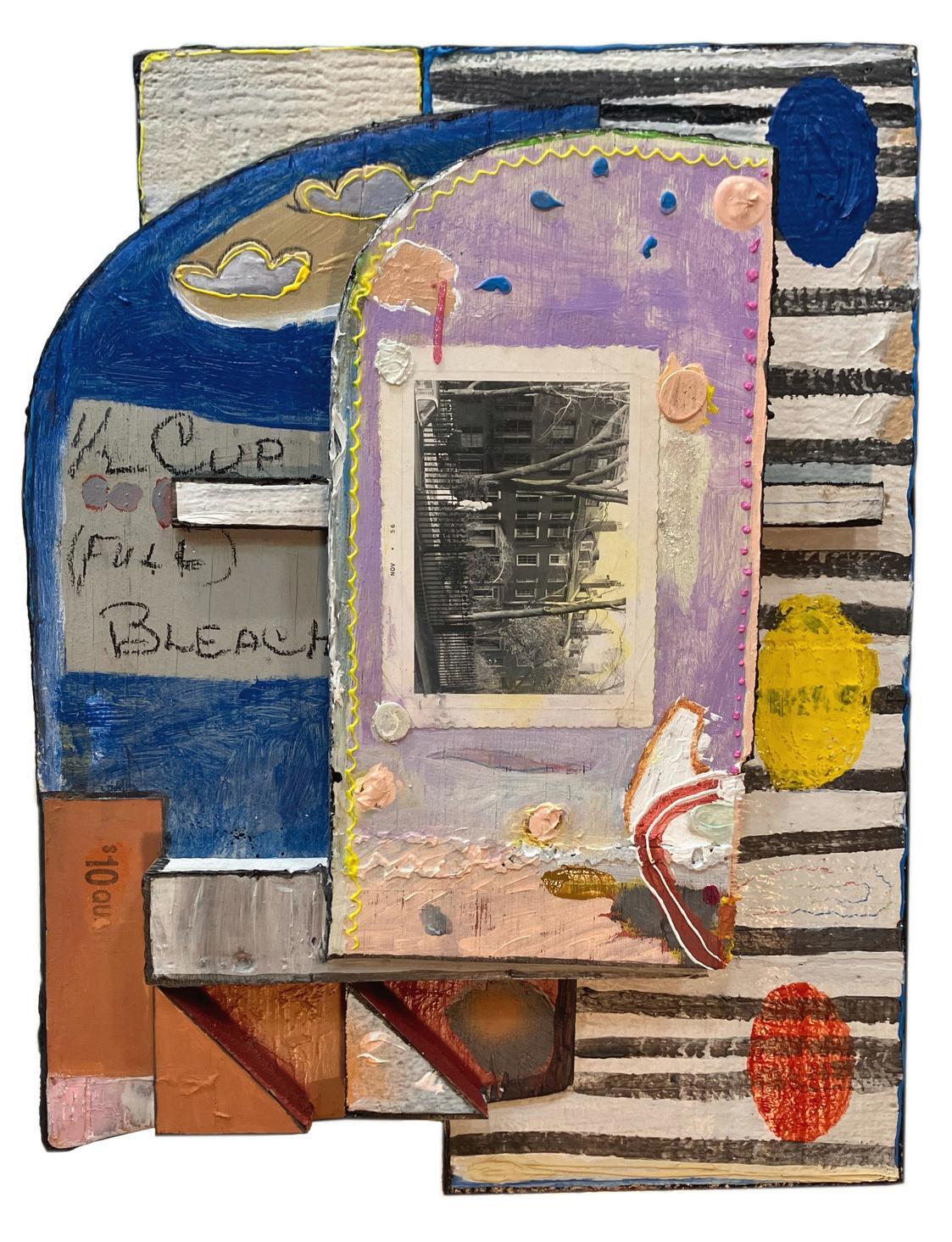 16) Jodi Hays, Her 2024, acryl c and reclaimed crazy qu lt and found masonite painters palette over panel 12 x 9 n