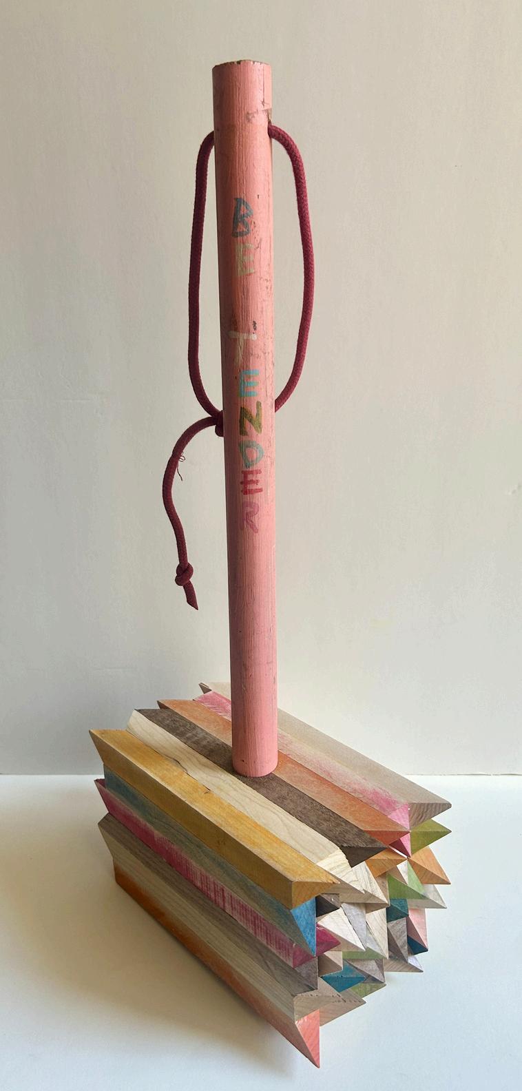 13) Jason Lord Tender ze (for Jenny and Carolee) 2026 Walnut map e cherry acry ic mi k paint, foraged black wa nut ink found c oset rod, Dads sweatsh rt str ng