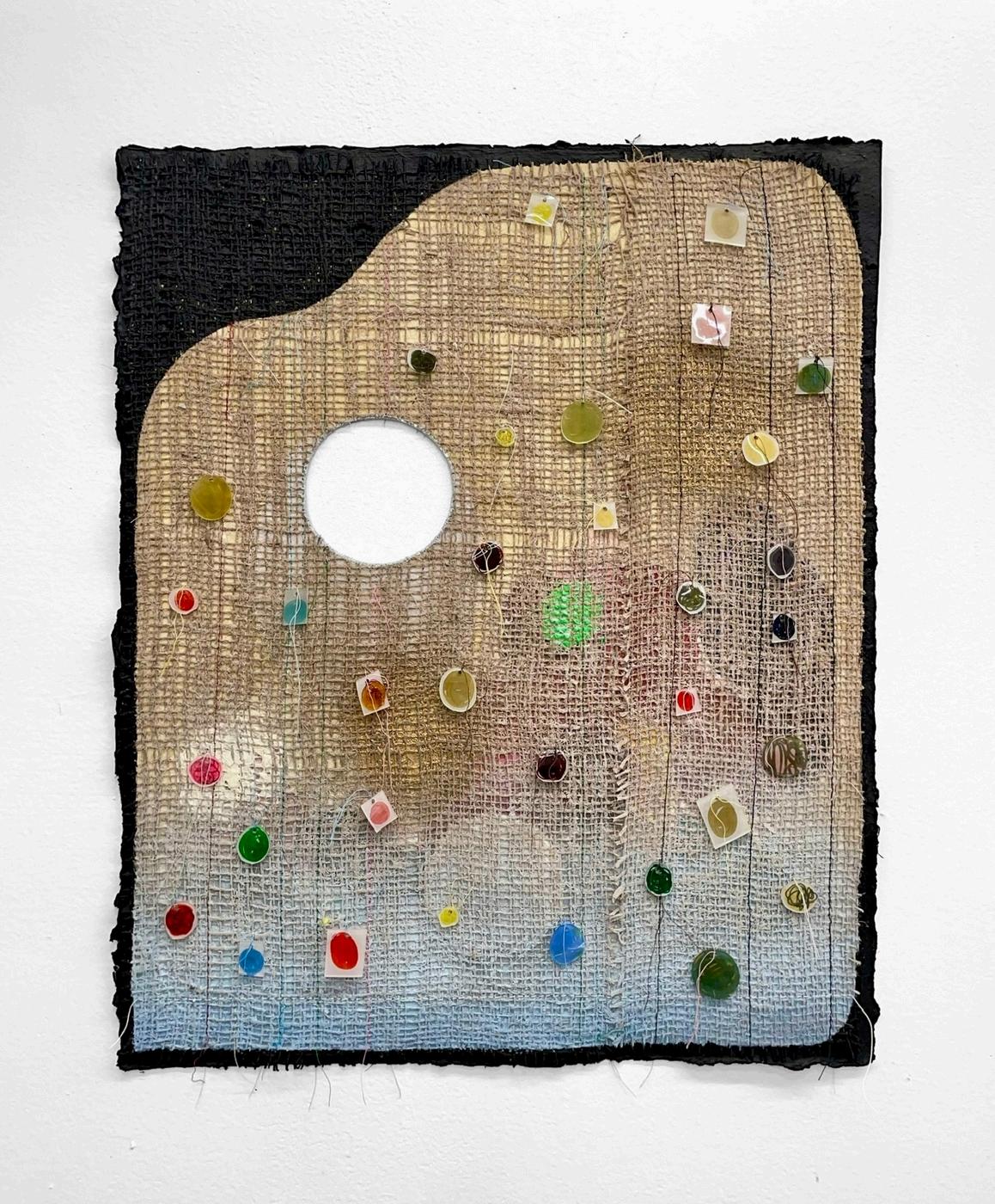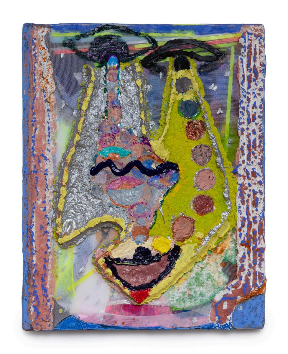 21) Leeza Meksin Sh ny! (Al en Tears) 2023, Oi oil st ck paper pulp blott ng paper spandex mesh and zip t es on canvas 11 x 14 x 2 n