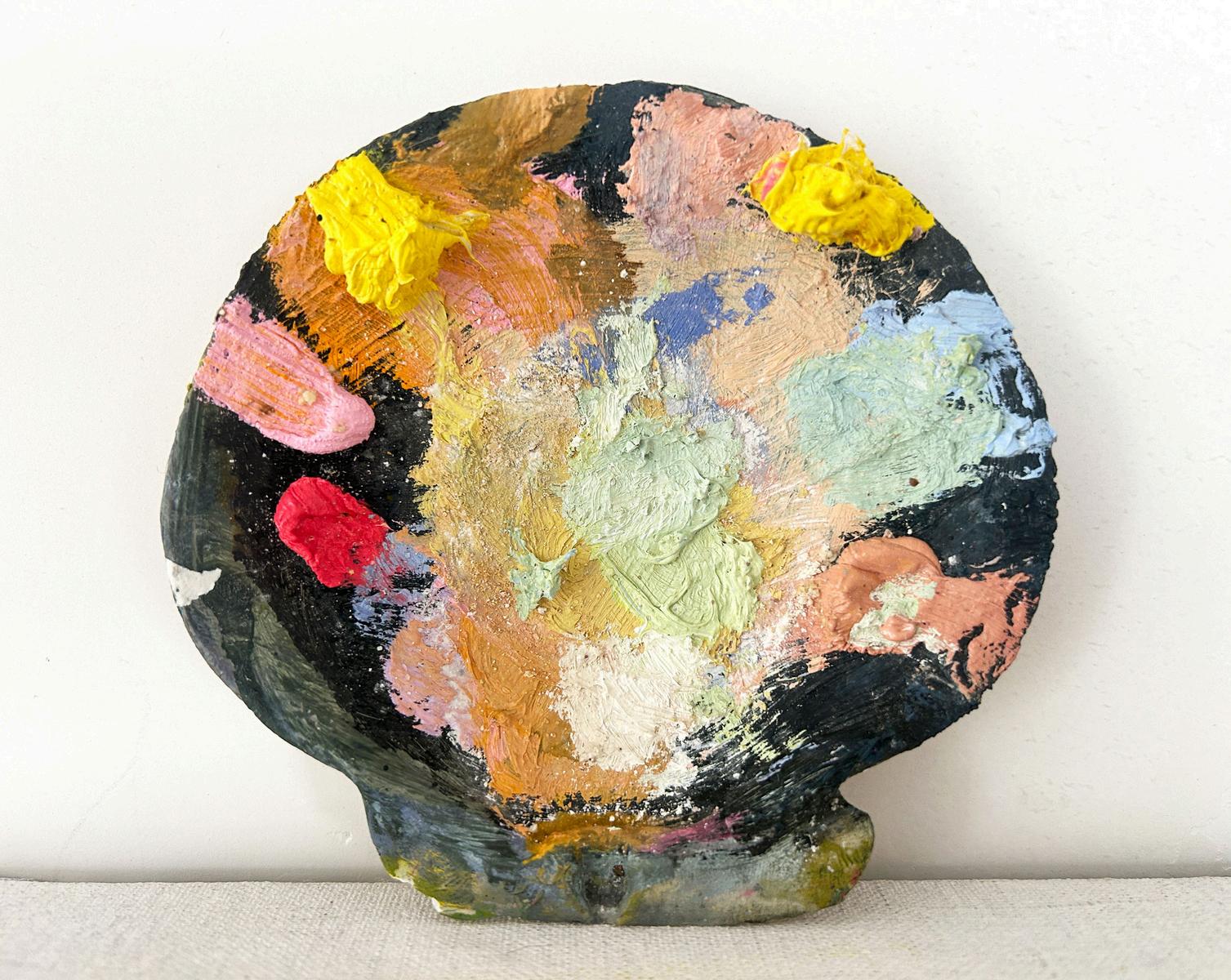 28) Tessa Greene OBrien Scal op Shel Palette, 2024-2025, O l wax, marb e dust on sca lop she l4 x 4 x 1 5 in