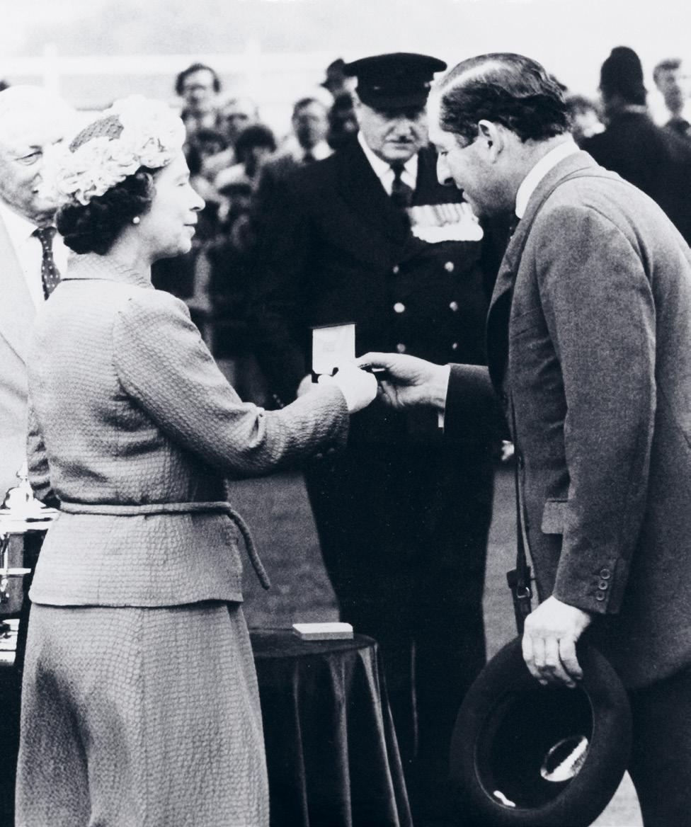 LEFT Queen Elizabeth II presents a piece of jewellery designed by David to winning trainer Major Dick Hern at Royal Ascot in 1980