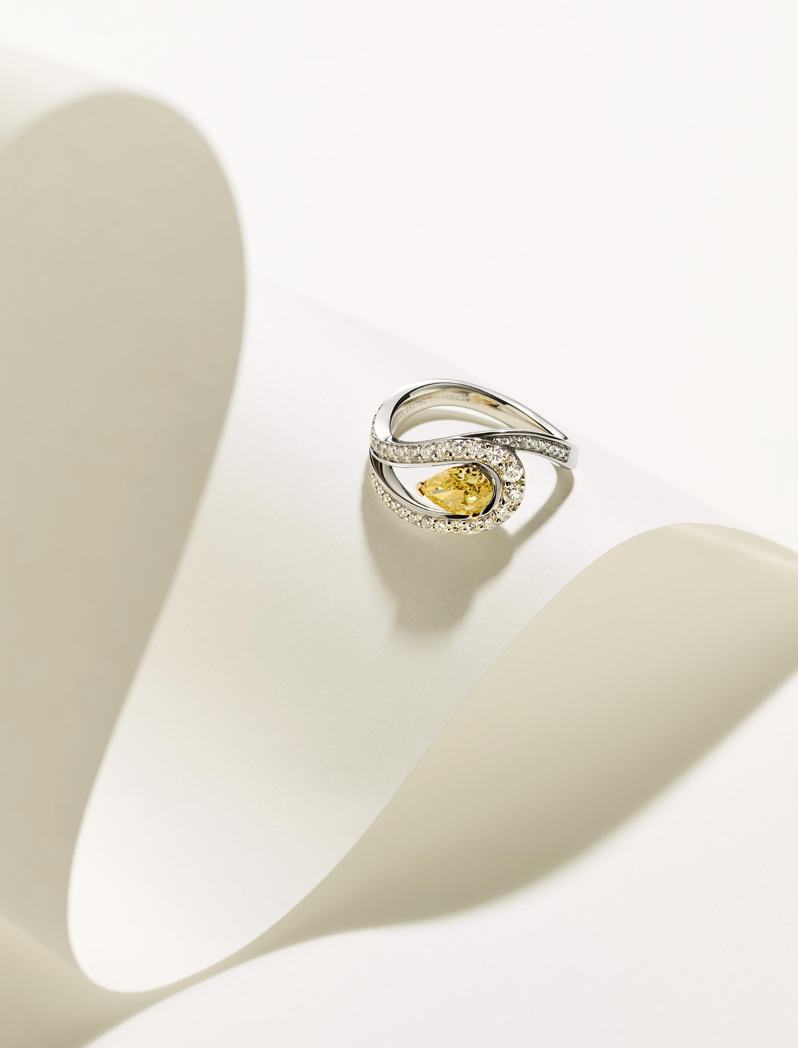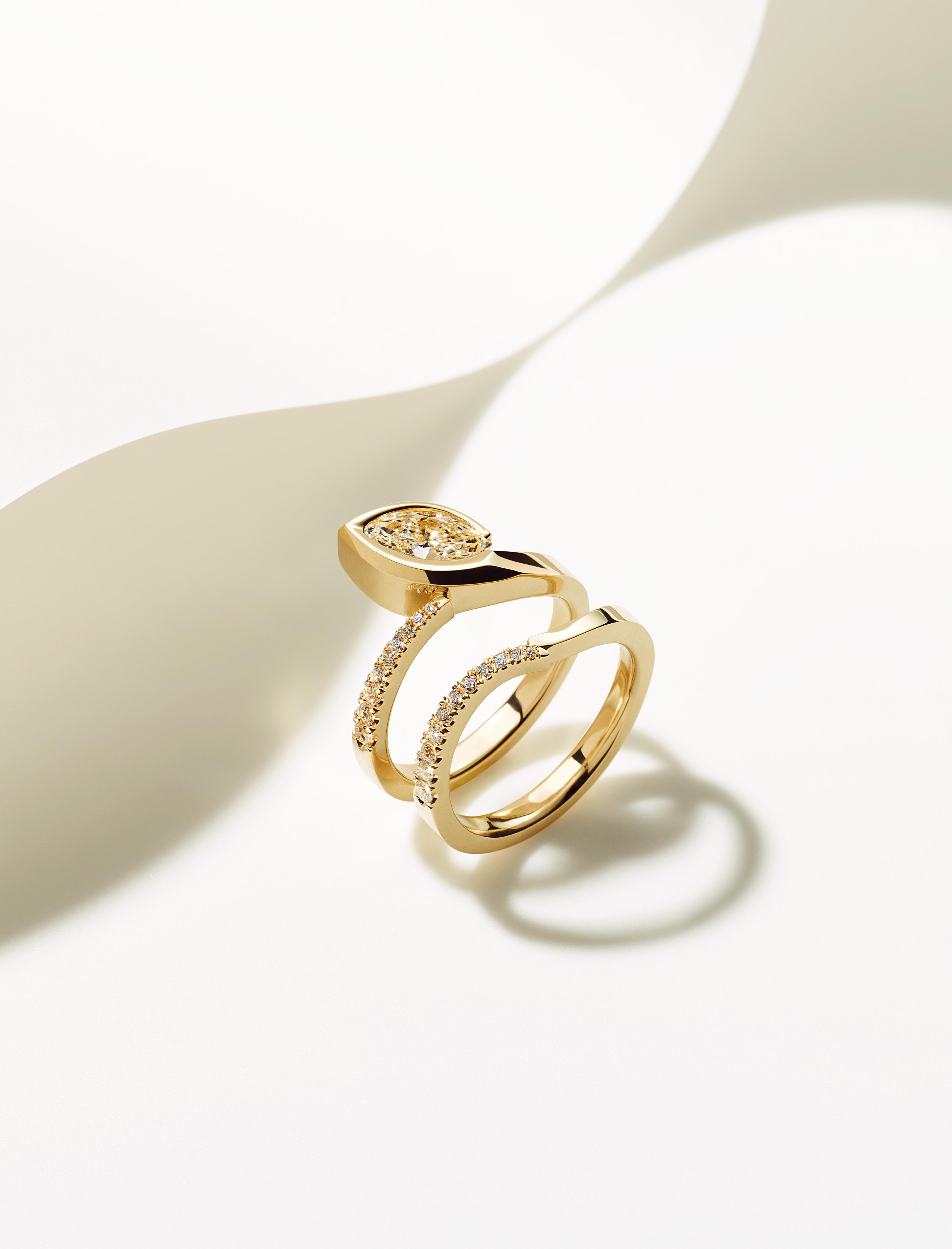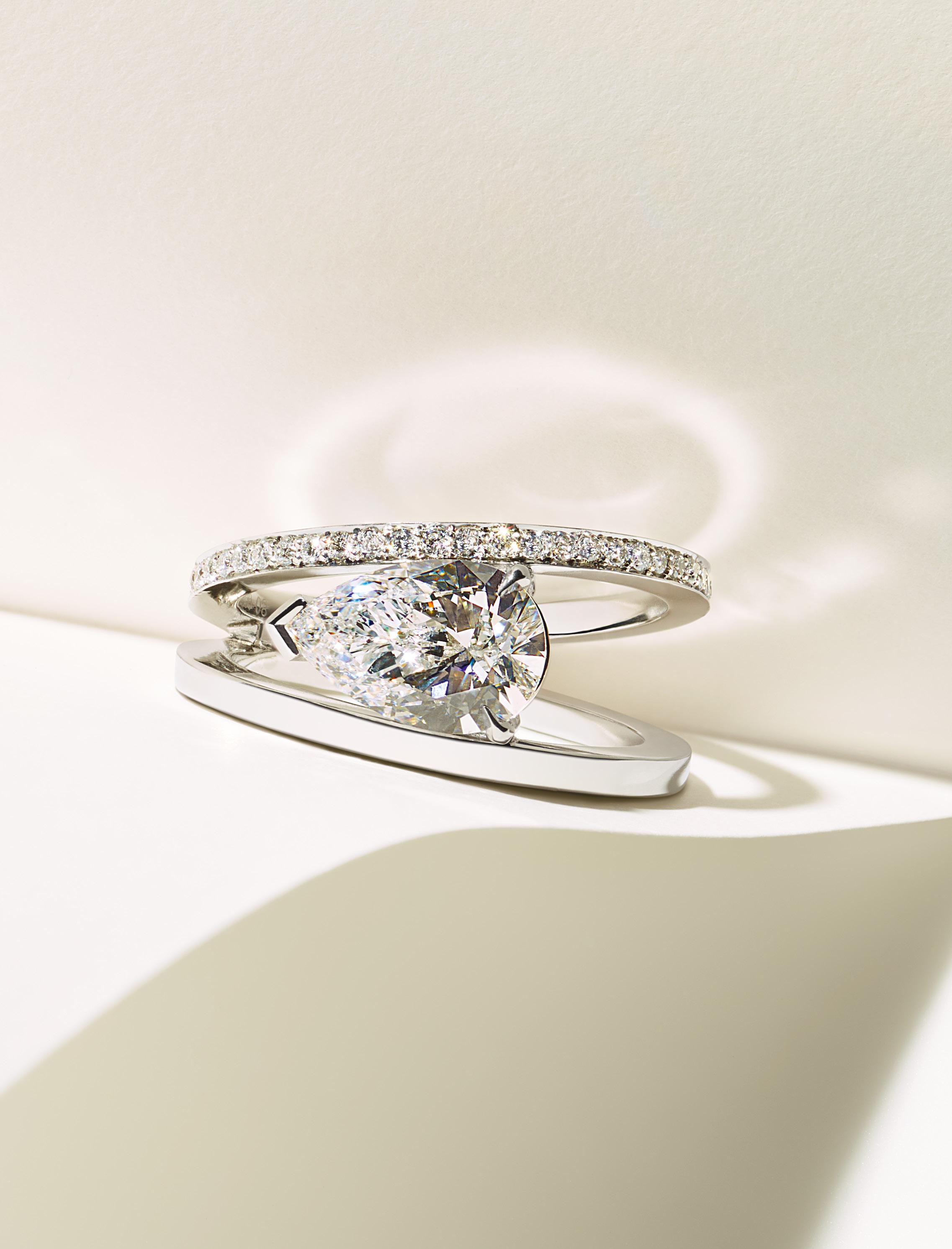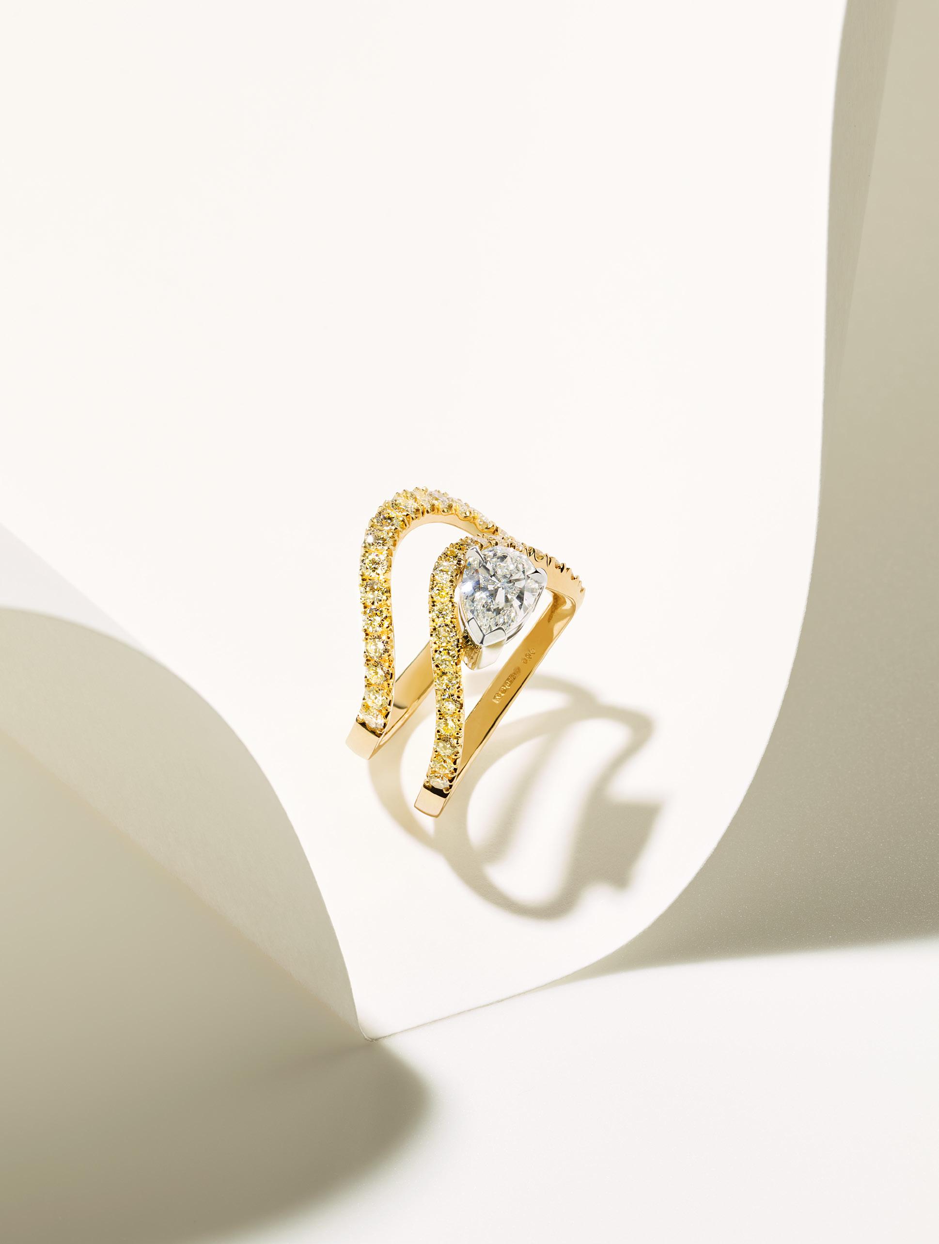 ABOVE 18ct yellow gold 1ct pear-cut diamond on curved diamond set band, £11,000, with matching curved diamond set band, £1,700