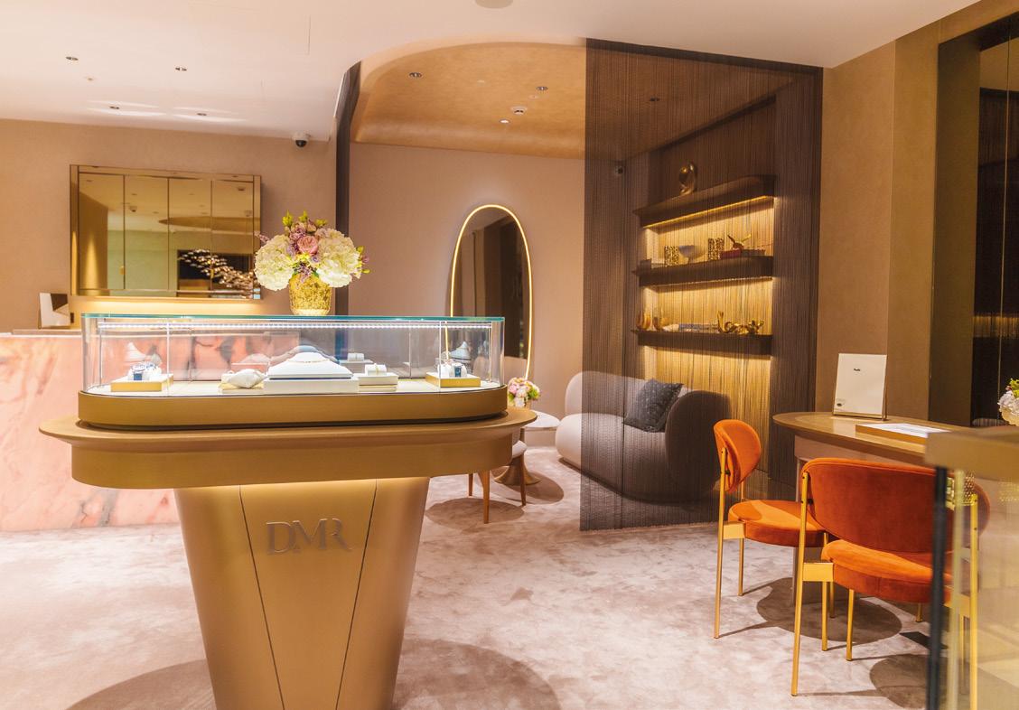 The recent refurbishment at the Altrincham store o ers a whole new way of presenting jewellery, bringing an immersive experience in a luxurious and comfortable setting. It embodies the future of UK ne jewellery design, creation and retailing. In the way that contemporary ne dining often presents both chef and kitchen on view in a restaurant so diners can watch their food being prepared, the talented craftspeople are on hand, based in the in-store workshop, bringing to clients all the talent that goes into making DMR jewellery. Showcasing the rare and traditional skills of the master goldsmiths, from hand-forging engagement rings to the exquisite art of micro stone setting, the goldsmiths’ work can be viewed up-close or via screens so no detail is missed. Everything is carried out on the shop oor, allowing clients to engage with the bespoke experience within the elegant showroom environment. At the heart of the boutique is the new design room, where jewellery designers guide clients through the creative process, whether for a new bespoke piece, or