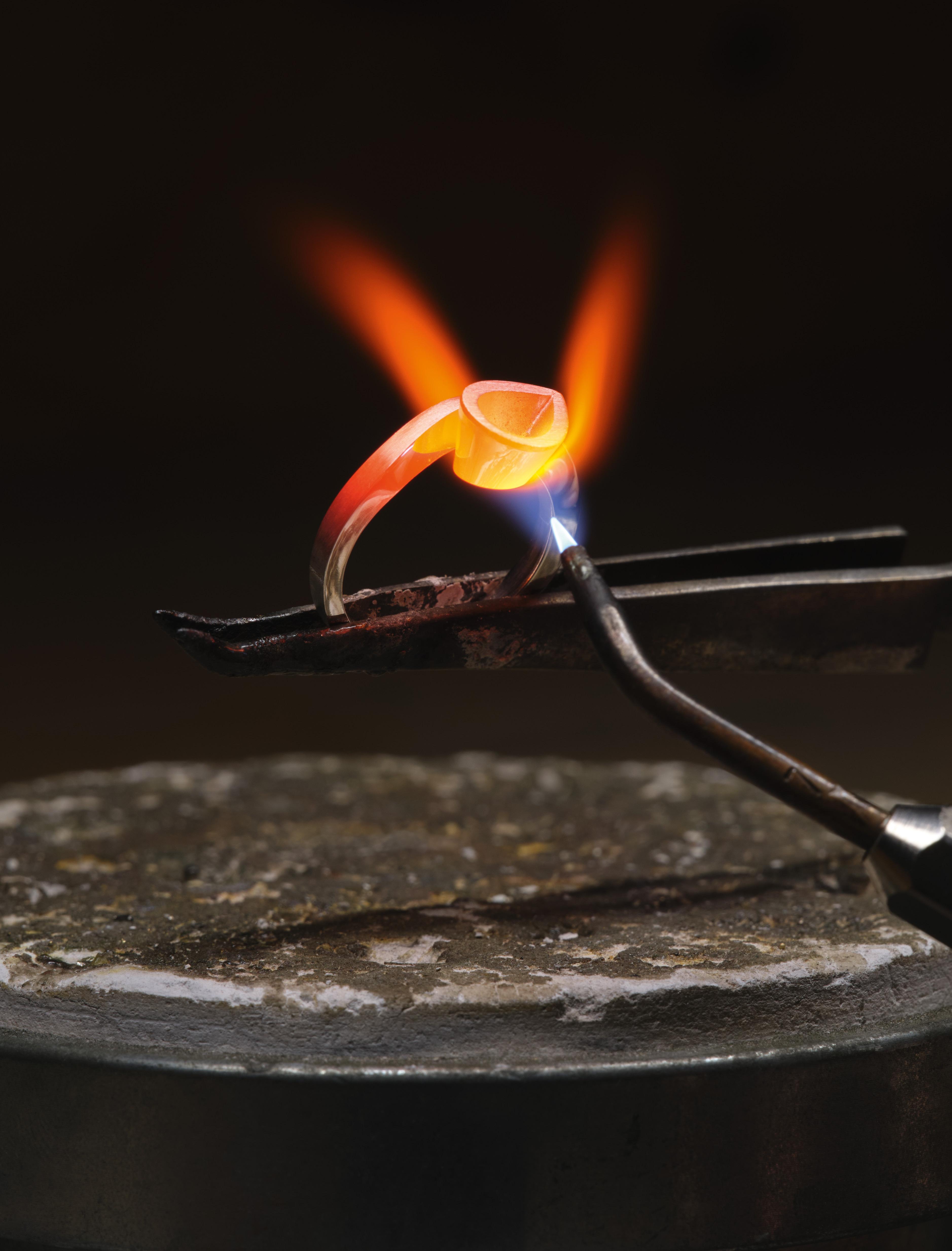 Alex Pritchard, master goldsmith at Altrincham, says it’s unusual for clients to see jewellery being made at close range. ‘Here, they can see all the processes involved,’ he says. ‘We start with a square bar of gold or platinum and take it all the way through to the nished set item. Quite uniquely, we make as much as we can on-site because we have the talent and facilities to do so.’