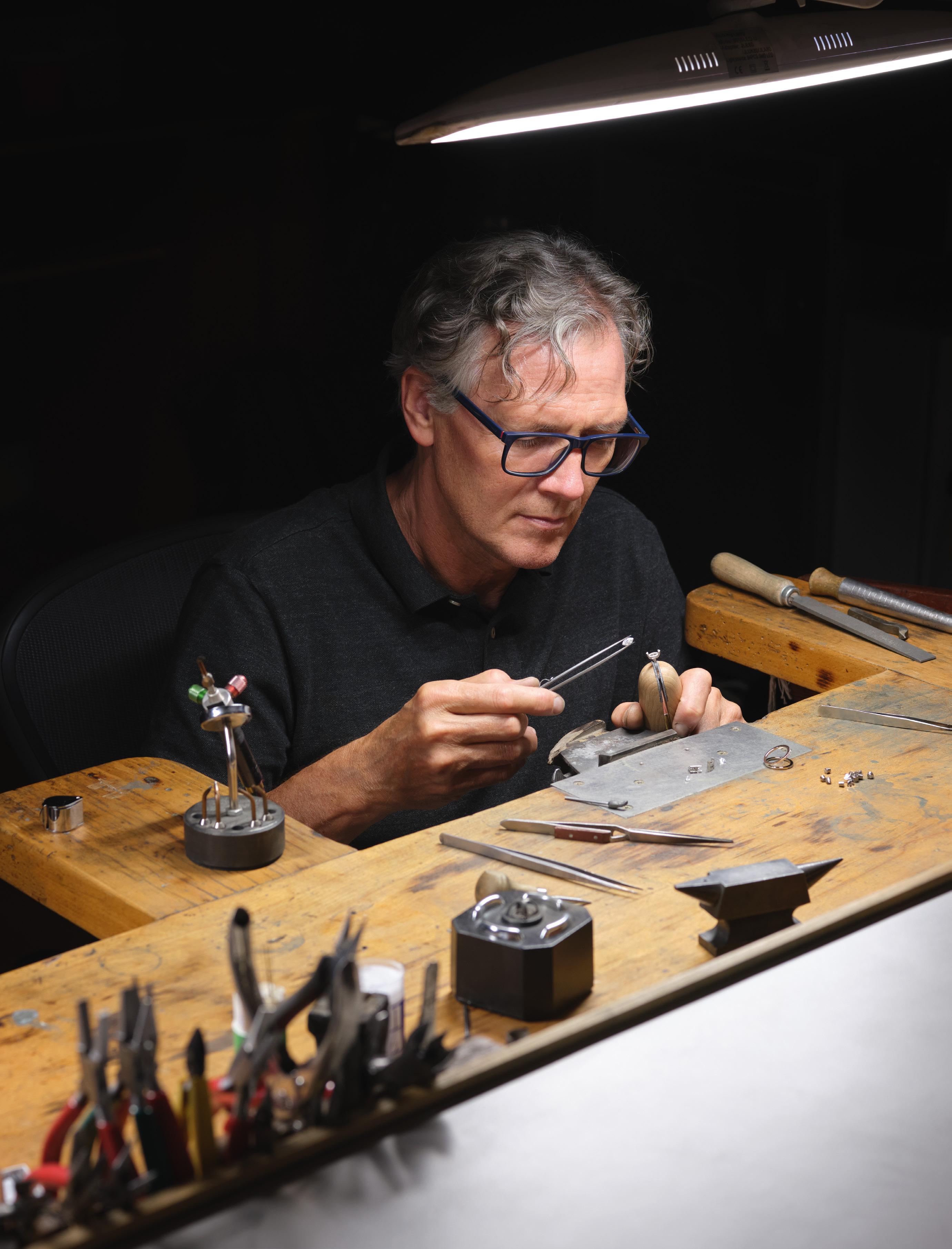 Clients are also fascinated by the tools. ‘We have precision microscopes for micro-setting and laser welders for more complicated pieces but many of our tools are similar to those in ancient times,’ Alex says. ‘They are also very personal. For example, I have two pairs of tweezers that I simply cannot work without. Even the workbenches take on individual characteristics – the jutting part that we lean on and hold our work on are all di erent, shaped by the way each goldsmith works.’