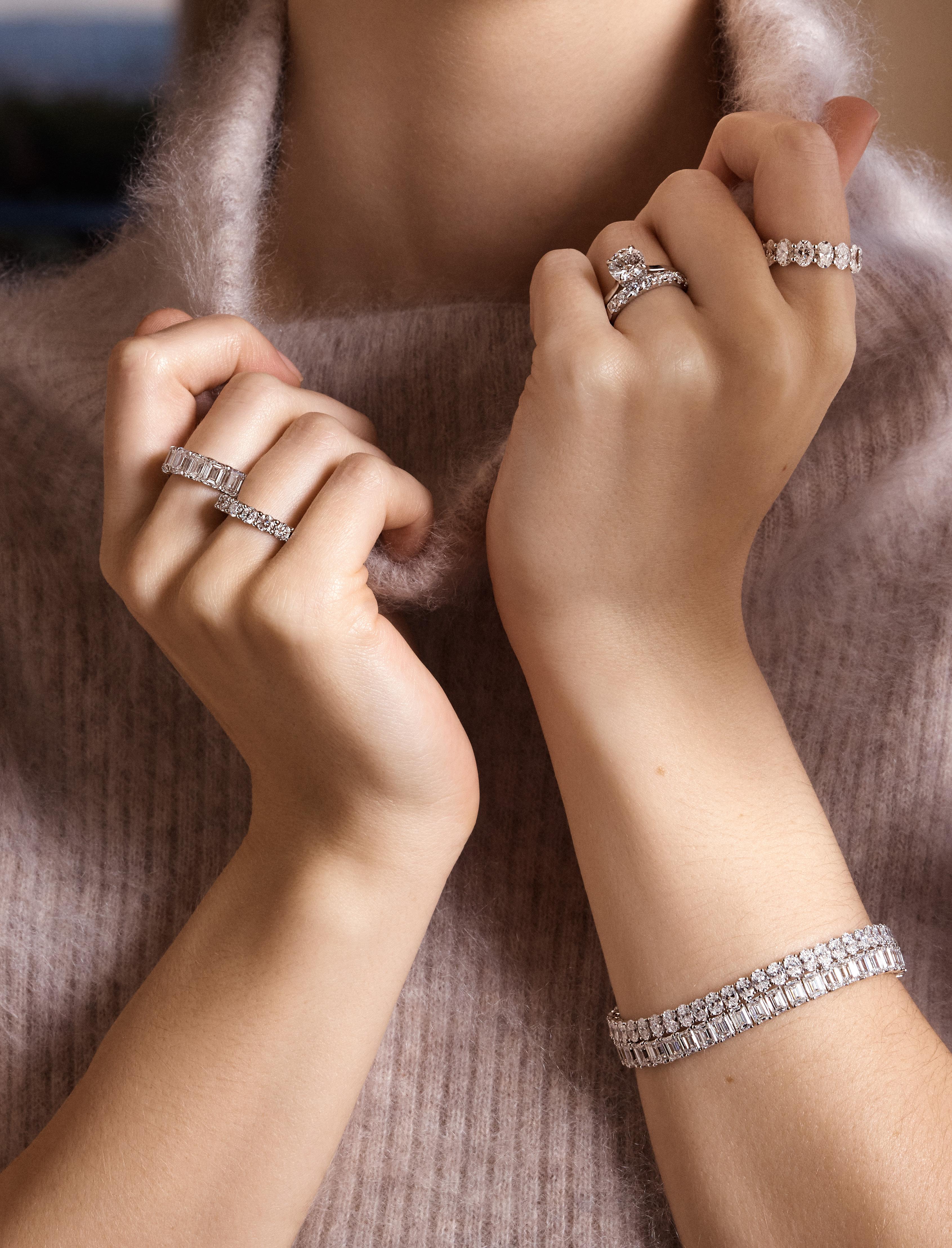 18ct white gold 4.84ct necklace, £19,000, Opera™; 18ct white gold 3.09ct earrings, £7,900, Opera™; platinum 6.13ct oval full eternity ring, £30,000; 18ct white gold 16.10ct round brilliant-cut bracelet, £50,000; platinum 23.51ct emerald-cut diamond bracelet, £120,000