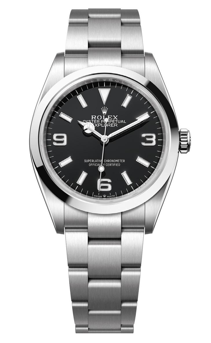 ABOVE, FROM LEFT Daytona Cosmograph in 18ct white gold, with diamond-set bezel and mother-of-pearl dial, £63,850; Explorer 40 in Oystersteel with Chromalight display, £6,650