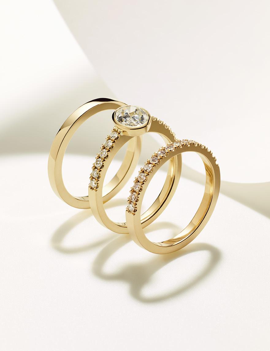 OPPOSITE 18ct yellow gold 1.02ct oval-cut diamond solitaire on curved band, £12,400, with matching diamond set band, £2,600