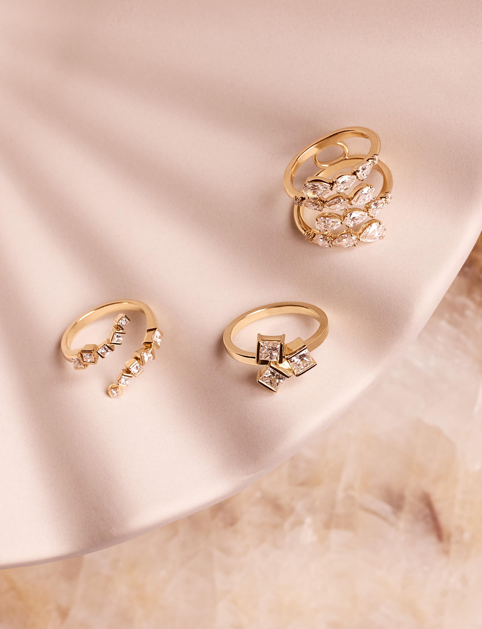 PREVIOUS PAGE 18ct white gold, diamond and sapphire long drop earrings, £55,000; 18ct white gold, diamond and sapphire collar, £117,000, High Jewellery Collection; platinum, 6.6ct sapphire and diamond ring, £98,500, High Jewellery Collection. ABOVE 18ct yellow gold diamond wraparound ring, £1,500 and 18ct yellow gold three-stone diamond dress ring, £4,100, both Hopscotch™; 18ct yellow gold pear-cut diamond four-strand dress ring, £7,600. OPPOSITE 18ct white gold and pear-cut diamond huggies, £5,700, Pearfection™; 18ct white gold pear-cut diamond pendant, £31,000 and 18ct white gold pear-cut diamond bangle, £10,900, both Ditto™; 18ct white gold pear-cut diamond torque ring, £5,900, Pearfection™; platinum and pear-cut diamond two-stone ring, £22,500, Ditto™