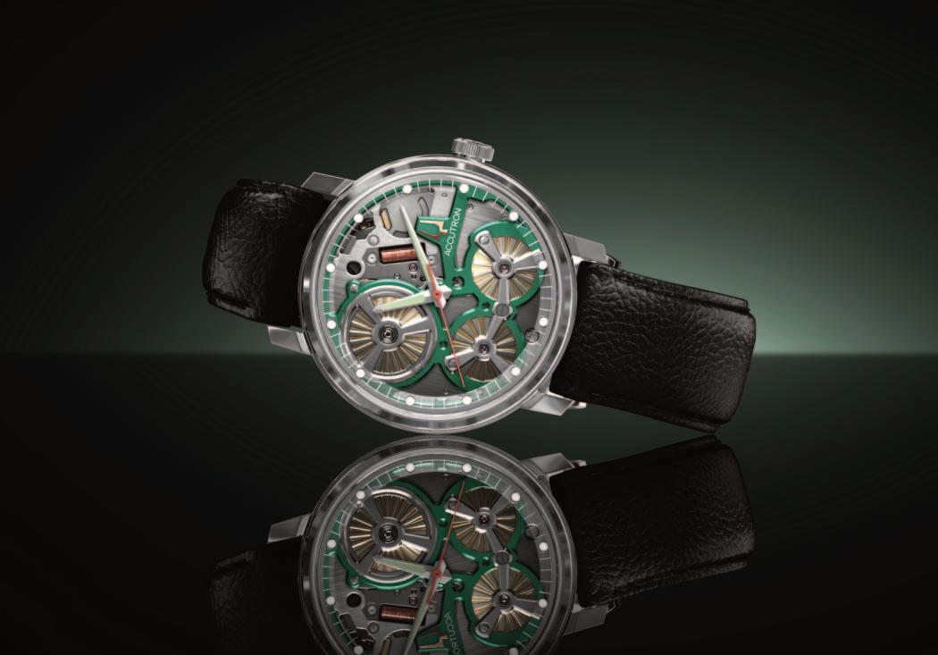 The open dial showcases just how the creation of electrostatic energy works. Rotating twin turbines, visible on the dial, power two motors that run the hour, minute, and second hands. Also visible on the dial, with its distinctive green coloring—a nod to the original—is the Accutron tuning fork logo.