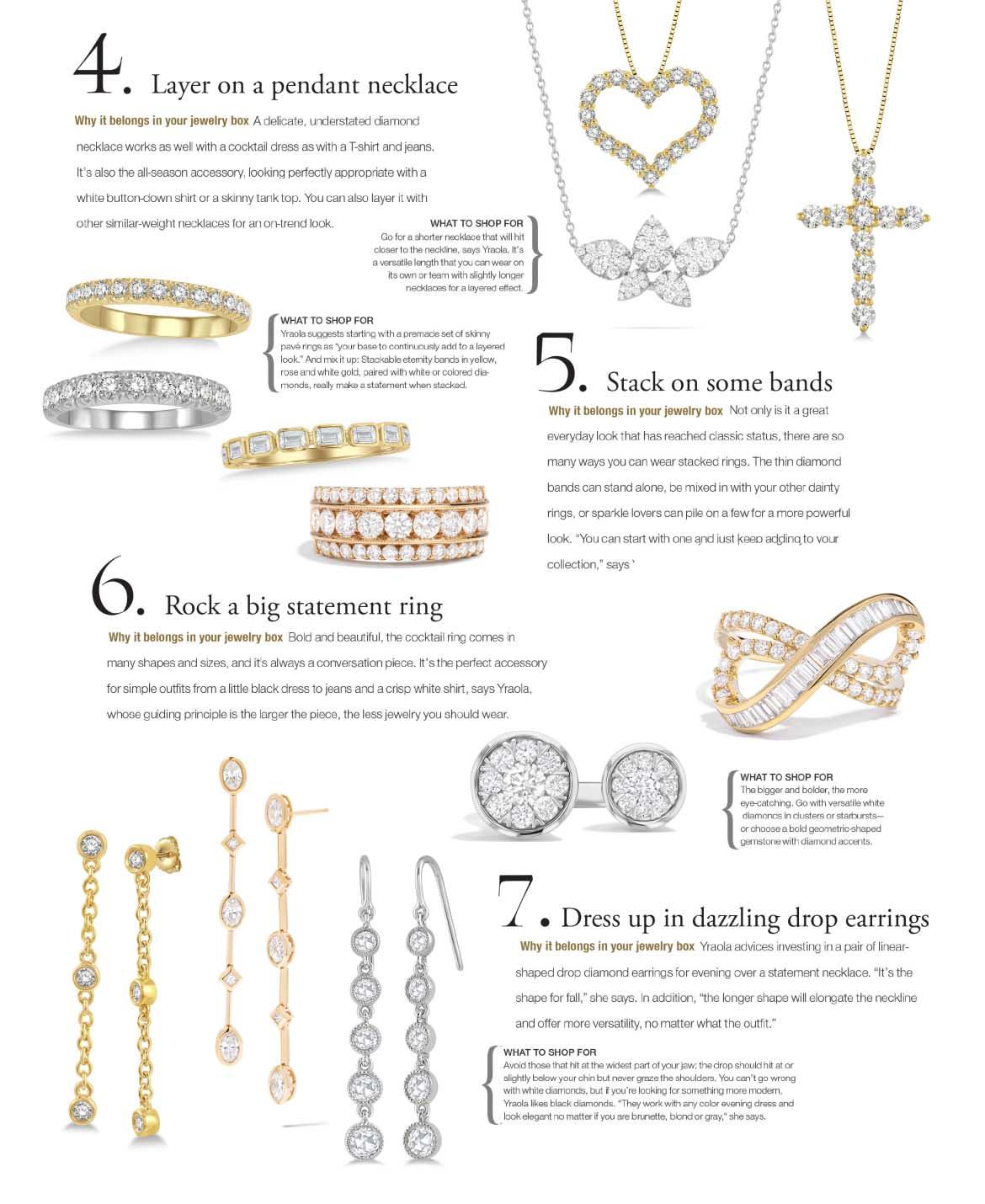 Why they belong in your jewelry box. Yraola advises investing in a pair of linear-shaped drop diamond earrings for evening over a statement necklace. “It’s the shape for fall,” she says. In addition, “the longer shape will elongate the neckline and offer more versatility, no matter what the outfit.”