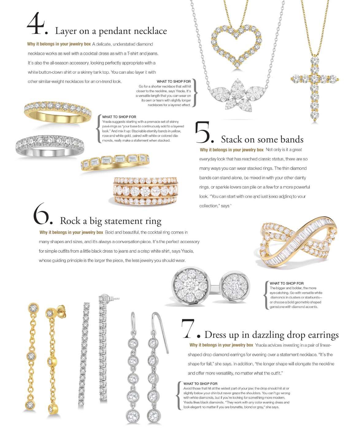 Why they belong in your jewelry box. Yraola advises investing in a pair of linear-shaped drop diamond earrings for evening over a statement necklace. “It’s the shape for fall,” she says. In addition, “the longer shape will elongate the neckline and offer more versatility, no matter what the outfit.”