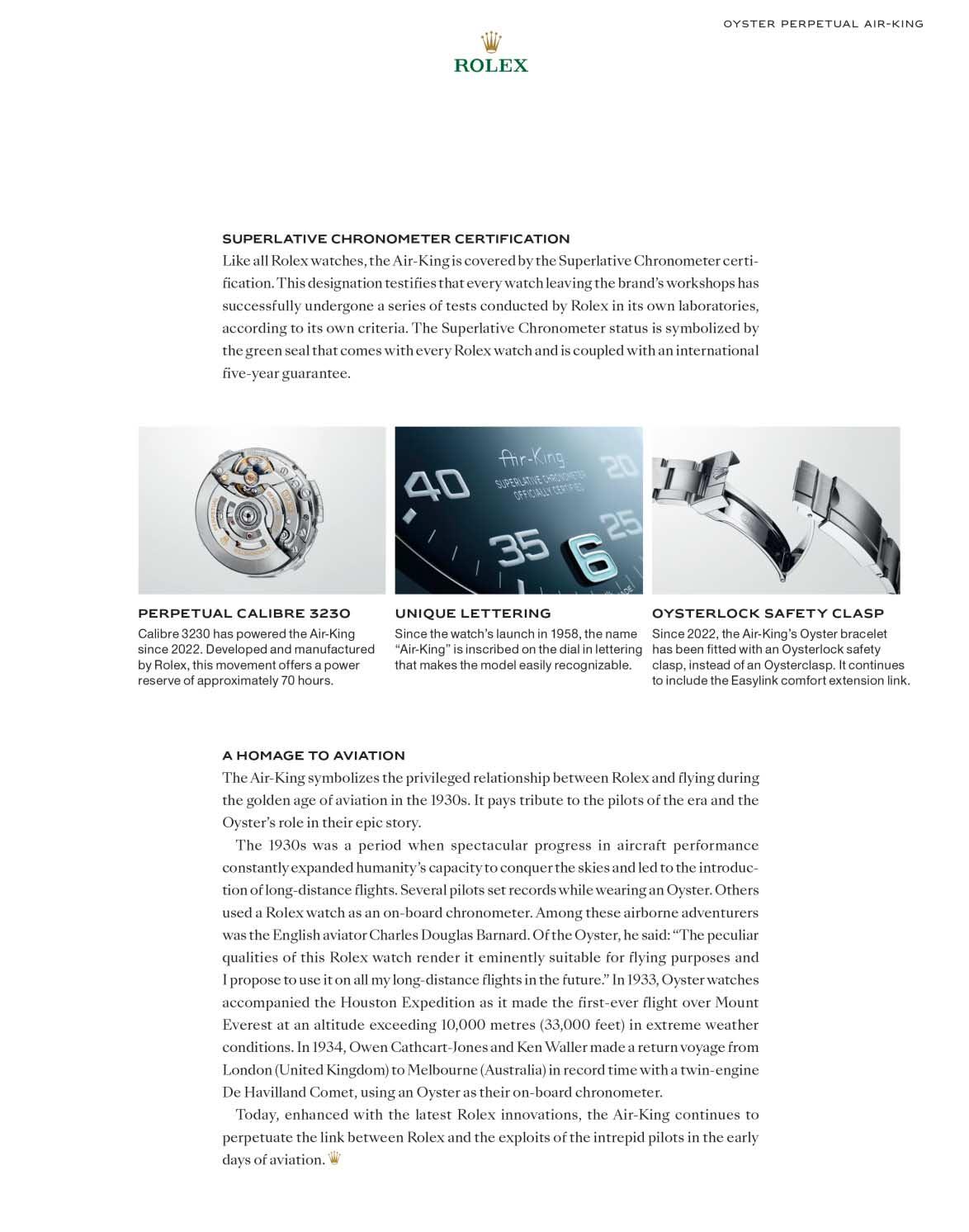 heritage the Rolex Oyster Perpetual Air-King, and those for whom the sky was a new frontier of adventure, exploration and groundbreaking achievement.