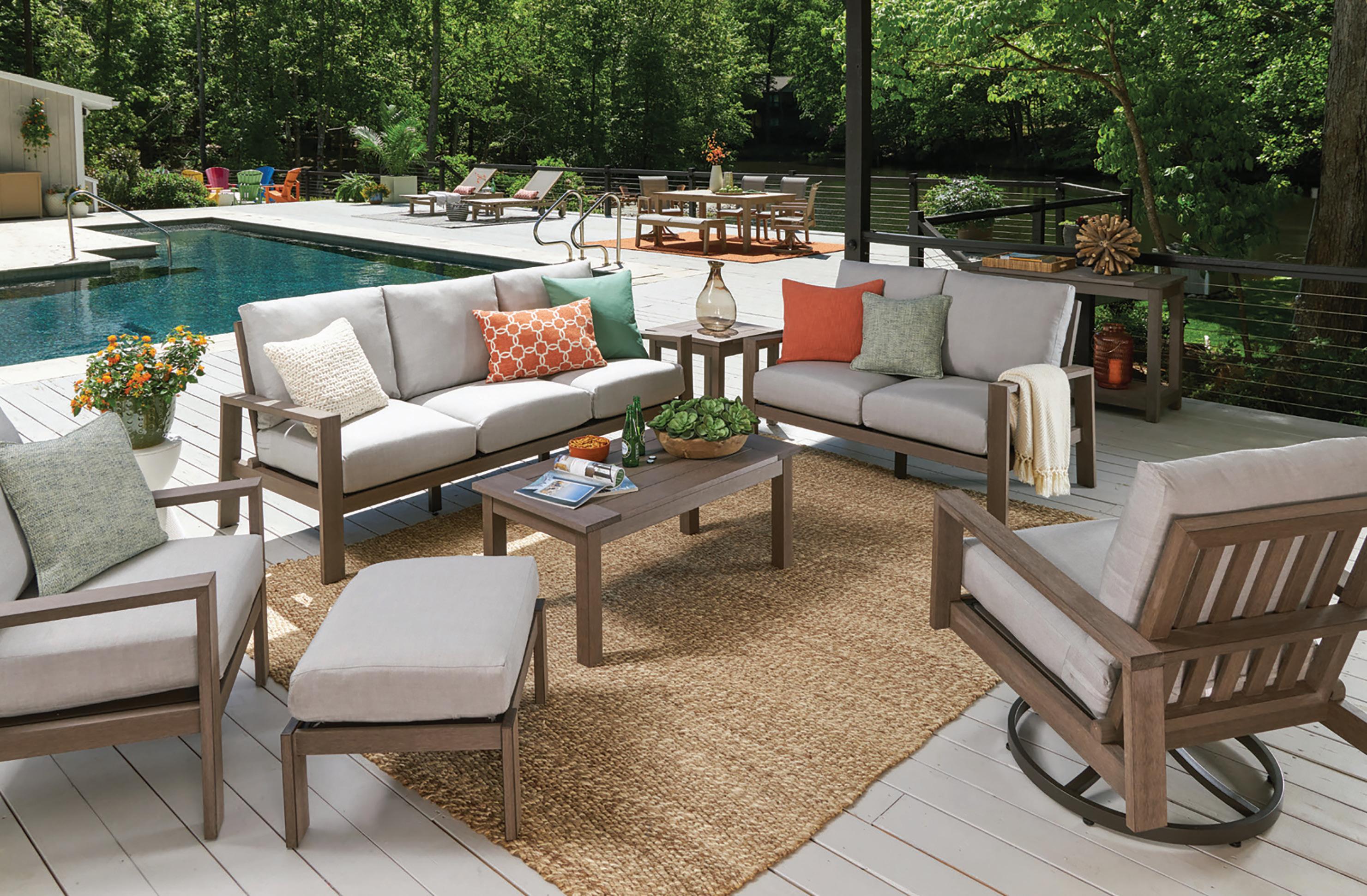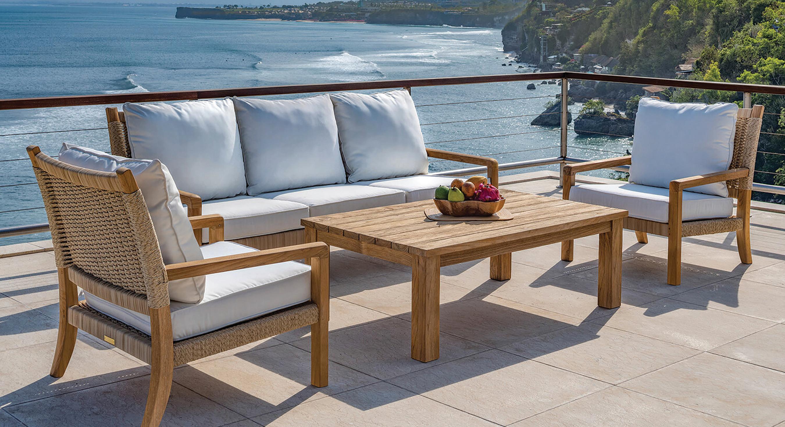 NEW! With a tip of the hat to classic teak outdoor furniture, the Della collection takes the classic teak category to a new level of comfort and practicality. The essence of traditional heavy and uncomfortable teak chairs of old are morphed into a classic yet light and comfortable design. Deep cushioned seating with a graphite performance fabric is combined with durable and timeless teak. This collection offers a wide range of pieces, including sofas, loveseats, swivel chairs, and lounge chairs.
