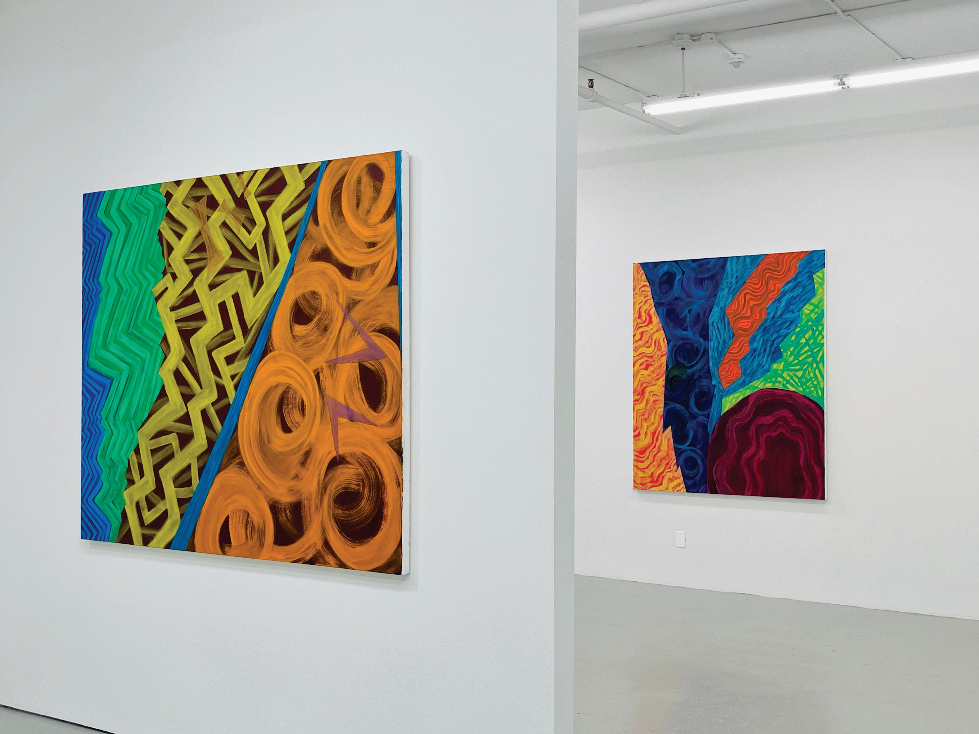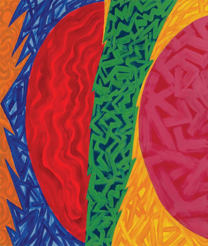 In recent paintings, as seen on the opposite page, large geometric shapes persist, but often, not fully visible. Now, the shapes extend beyond the canvas edge so we only see a detail of the form. Isolated shapes do exist in some paintings, but mostly as open framed structures created by a solid border, see Naga, 2022 on page 23 as an example.