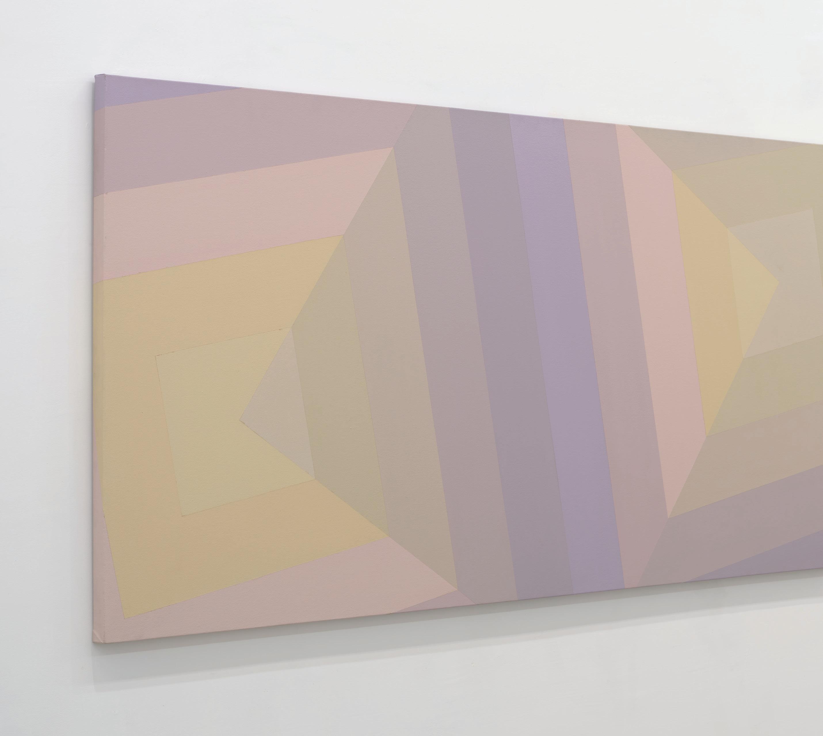 In these works, many of which have never been previously exhibited, one sees Berg’s repeated conceptual framework of evolving cause and effect from the Infinite to the Finite in systemizing the Kabbalah. This also includes permutations of binary formal properties including compositional formats such as horizontal versus square perimeters and single versus double concentric structures within a given composition; saturated versus desaturated color palettes; flat versus highly textured painted surfaces; hard edged versus diffused borders of geometric forms; and mirror images of such binary properties both within a single structure and composition or across different compositions.