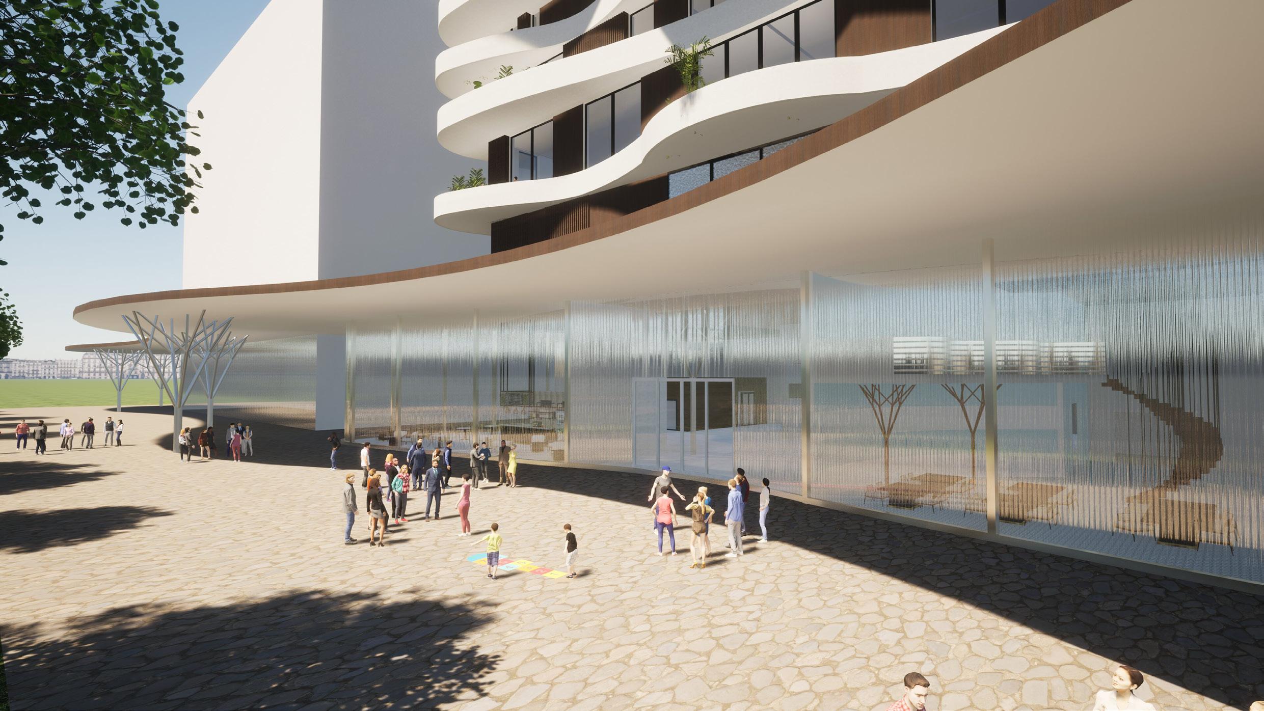 Het ontwerp voegt zich harmonieus in de omgeving en maakt gebruik van CLT-kolommen, die zowel structurele als esthetische waarde toevoegen. Het Parelpaviljoen is een duurzame en waardevolle toevoeging aan dit bruisende stadsdeel.