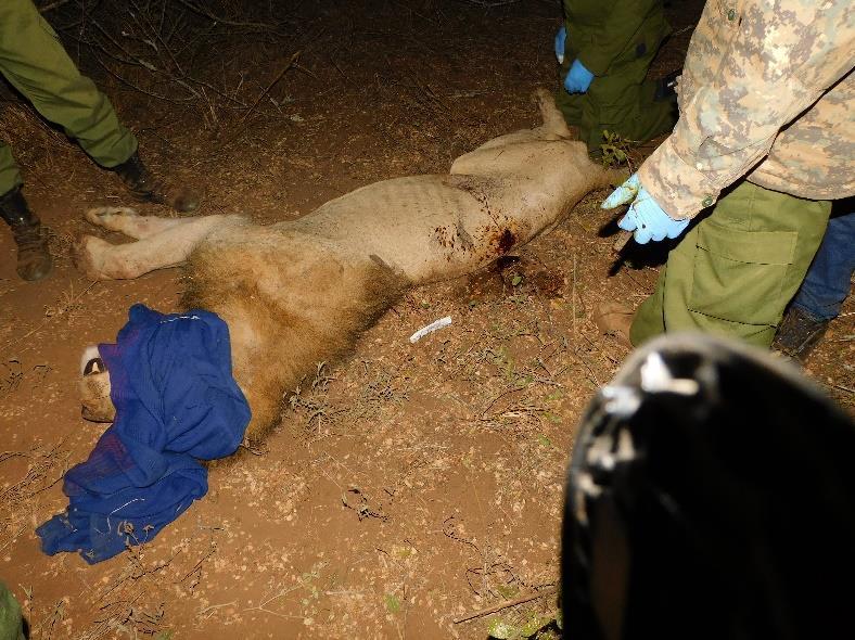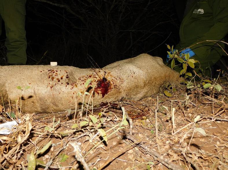 The carcass was dehydrated and had haemorrhages and congestion on most body organs. More significantly, it had a deep wound that was suspected to have been an arrow injury. The wound was heavily infected and likely contributed to the cause of death.