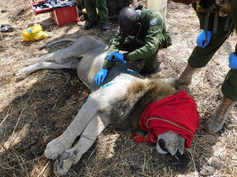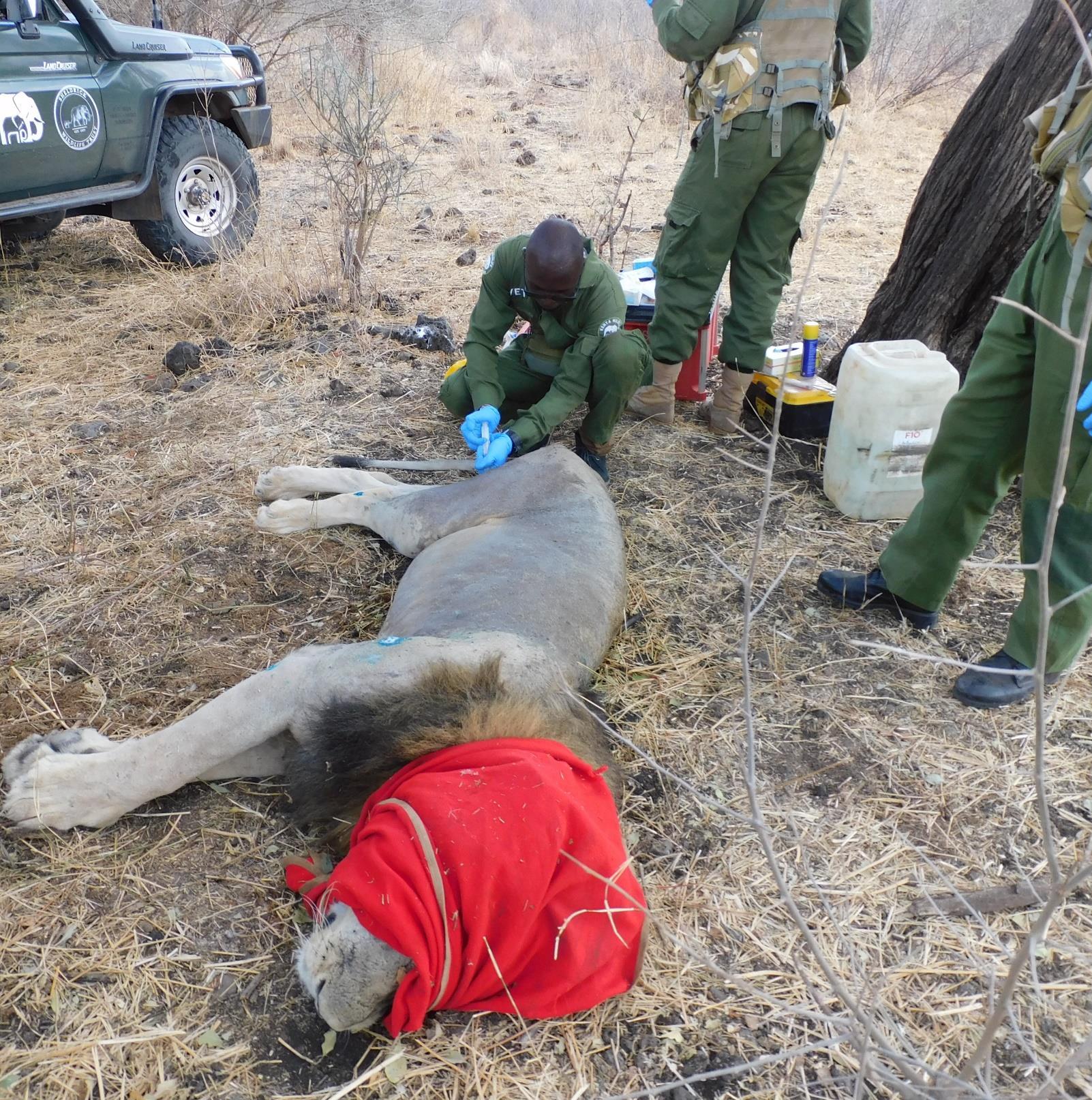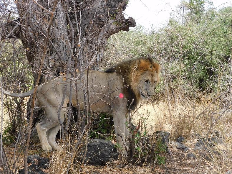 The lion was approached slowly with a vehicle and darted on the right shoulder with a combination of 6mgs Medetomidine and 270mgs Ketamine.