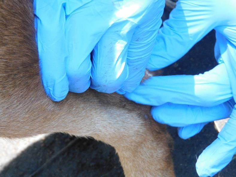 The dog was fitted with a muzzle and administered a subcutaneous injection of 0.8 ml Triquin (a combination of Quinapyramine sulphate and Quinapyramine chloride) on the dorsal aspect of the neck. The subcutaneous swelling was confirmed to be due to a mango worm infestation, which was manually extruded. The wound was flushed with sterile saline and infused with an antibiotic ointment. Additionally, he received 10 mgs of Ivermectin subcutaneously and an intramuscular injection of metabolic stimulants. No adverse reactions were observed following drug administration, and the overall prognosis was considered good.