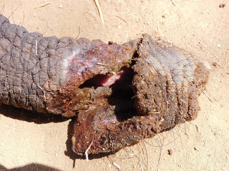 Ngare Mara was found inside the enclosure, calm and feeding, while being comforted by her caregivers. Examination of the trunk revealed a fresh, irregular cross-sectional cut, though no active bleeding was observed. She was hand-injected with 7mgs Etorphine and became recumbent within five minutes.