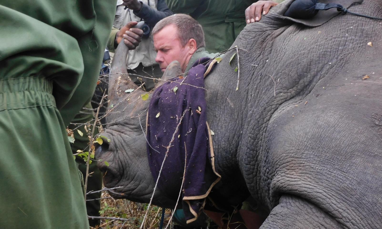 The rhino was darted with 2mg Etorphine and 20mg Azaperone then stabilised with 8mg Butorphanol