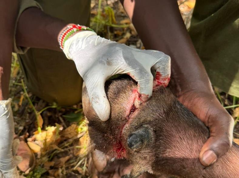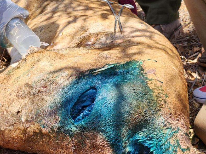 Examination revealed septic predation wounds on her left knee joint area, suspected to be inflicted by a lion. The joint was also affected. A bone fragment from the distal femur was removed. The wounds were thoroughly cleaned, flushed with Hydrogen peroxide, infused with tincture of Iodine and then packed with Antibiotic pessaries. Topical antibiotic spray was applied on the wound. She was additionally given Amoxicillin antibiotics, Flunixin anti-inflammatory and a metabolic stimulant parenterally.