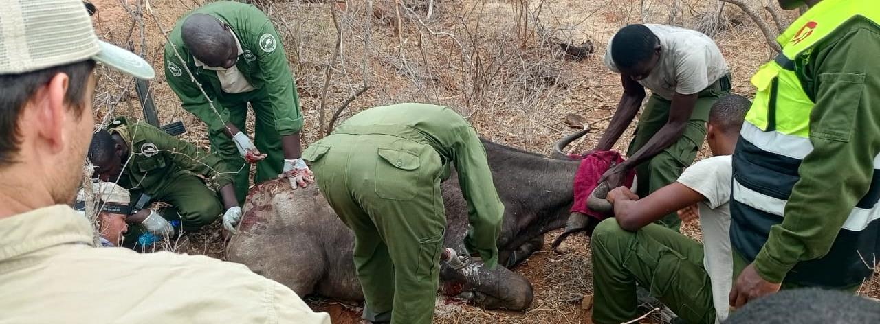 This buffalo was spotted by Manda Bay management with a wire snare on her left forelimb