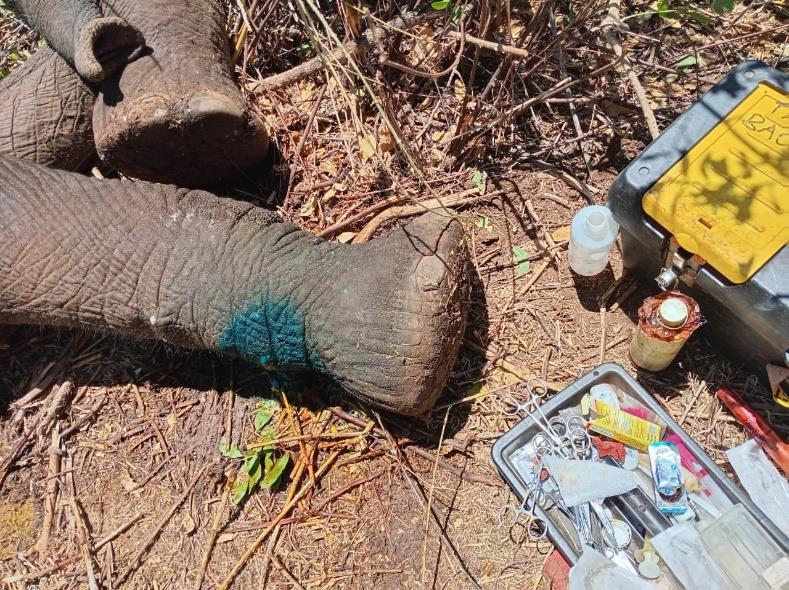 Examination revealed soft tissue swelling around the right knee joint and right above it. There was a scar formation on the area which suggested that the elephant was previously wounded. There were no discharges and the limb appeared to have healed in that way therefore no treatment was required.