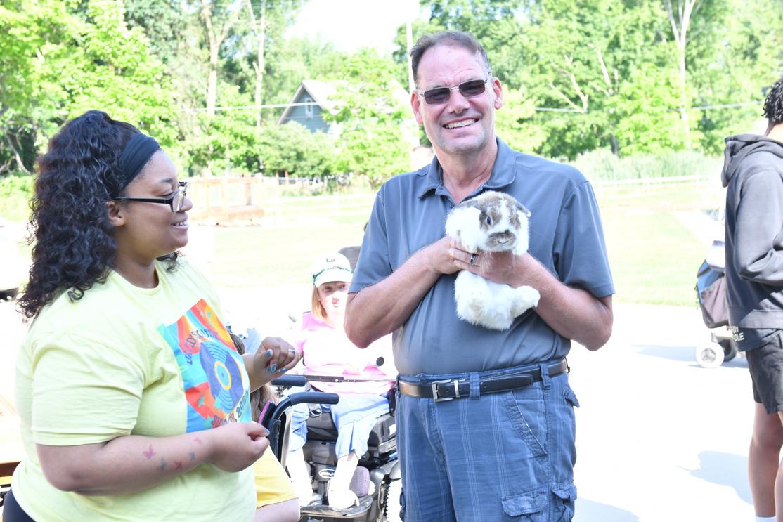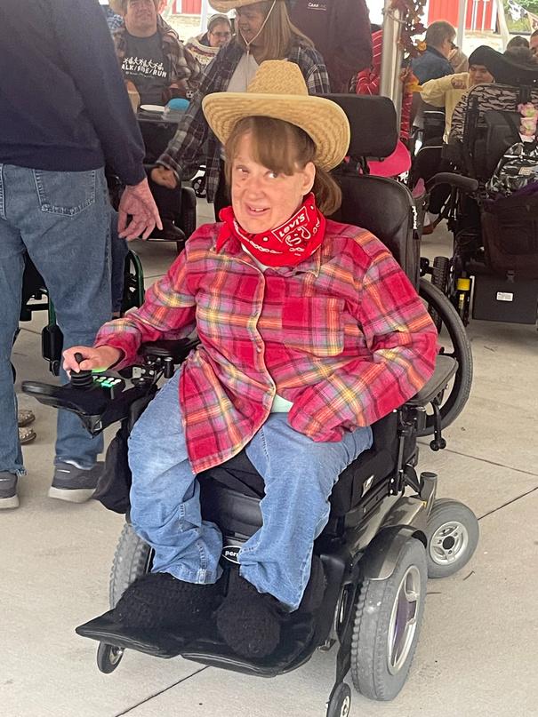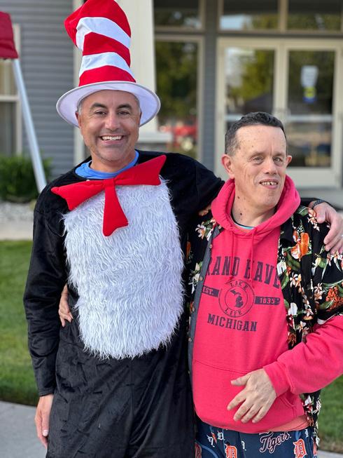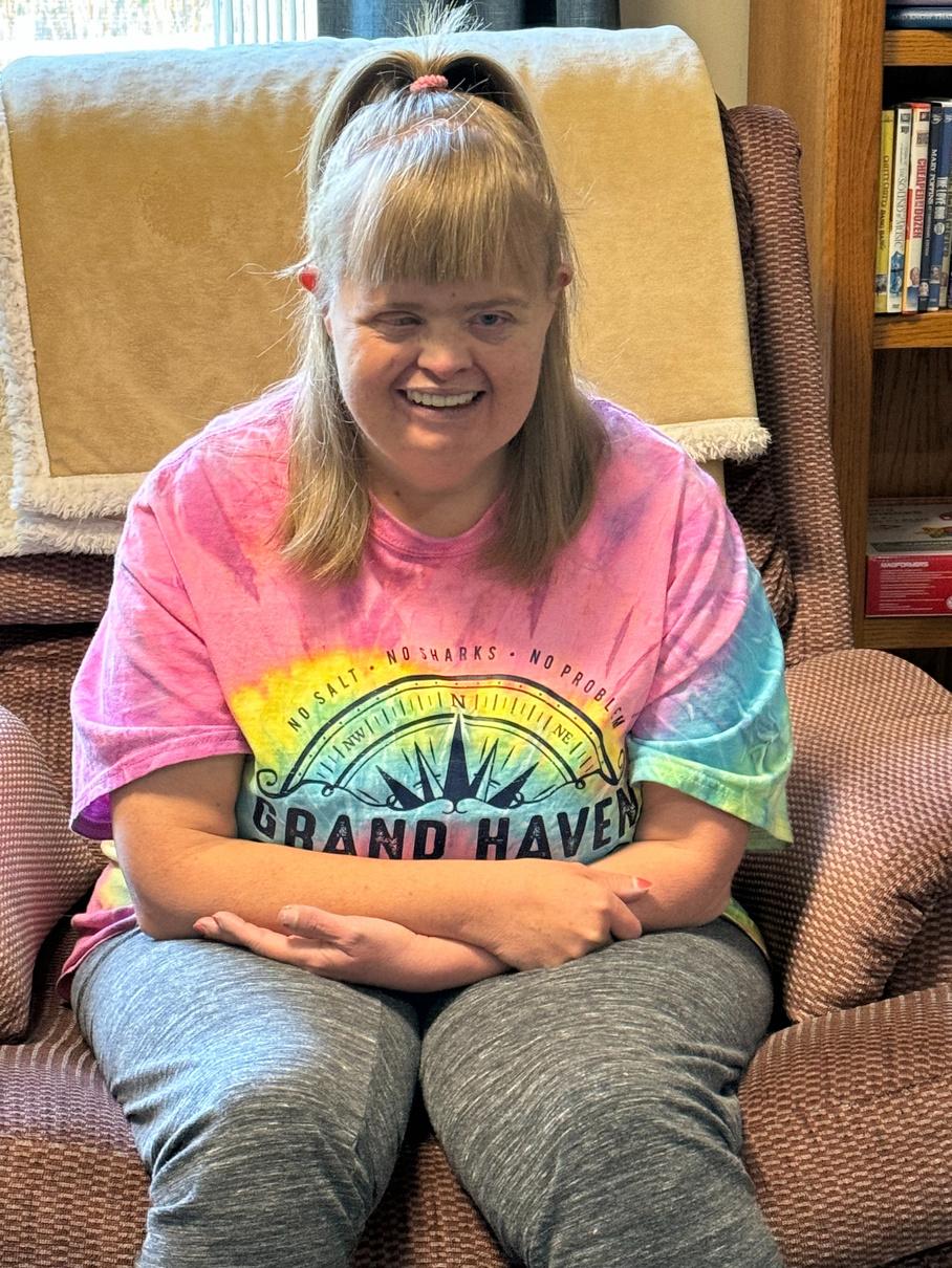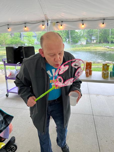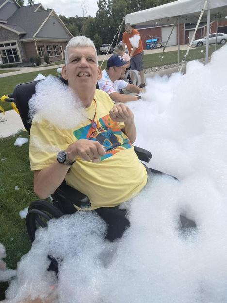 Jeff is a member of many different “teams ” As a long-time resident in House 1, he is an important member of this team Jeff is often the first to volunteer to assist with any type of clean-up or set up of tables and chairs and is a constant and helpful presence anywhere in our community here in Wyoming Jeff works at Care-Linc several times per week and loves his teammates. He also volunteers at Calvary Church with some of his other friends as well. Jeff has an amazing support team of family and friends as evidenced by the picture above