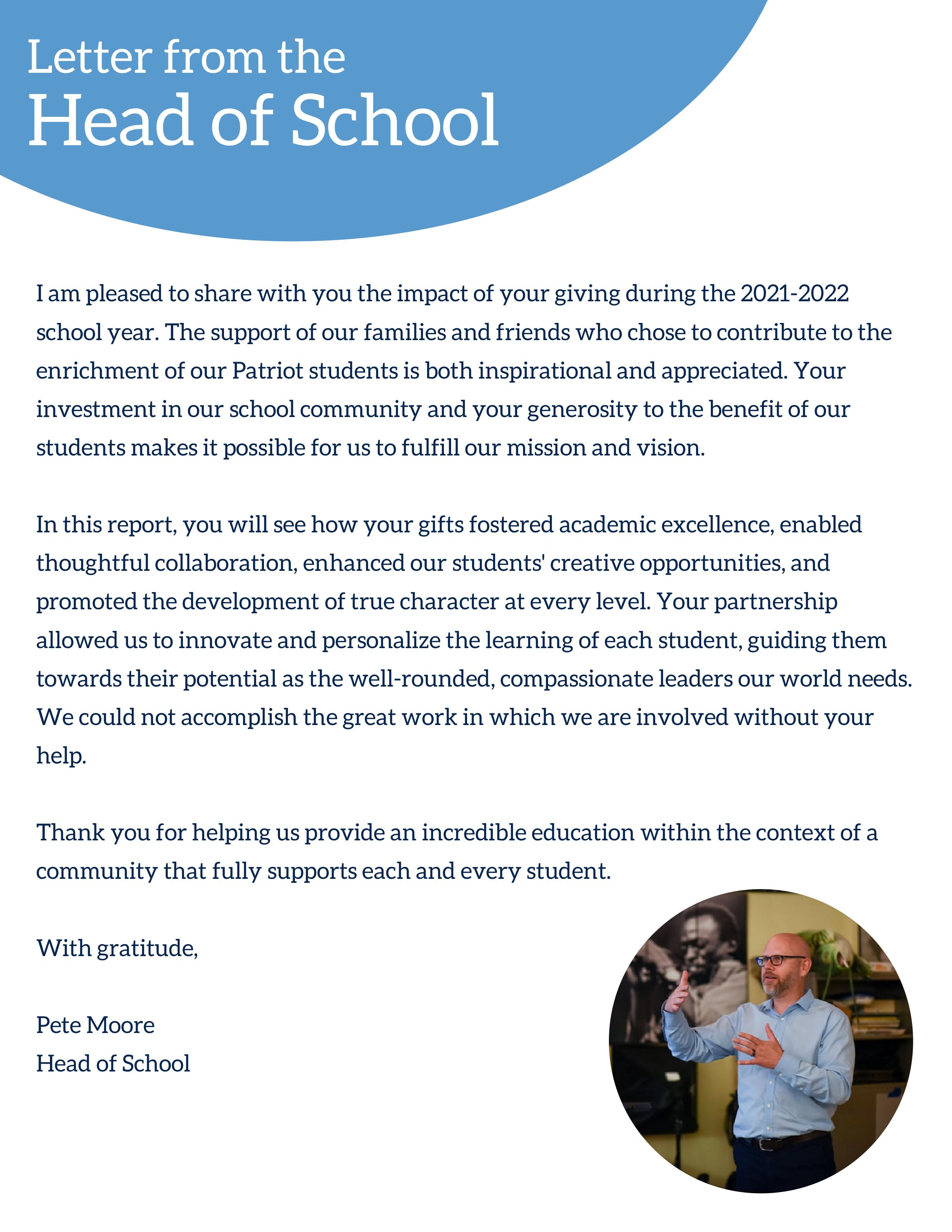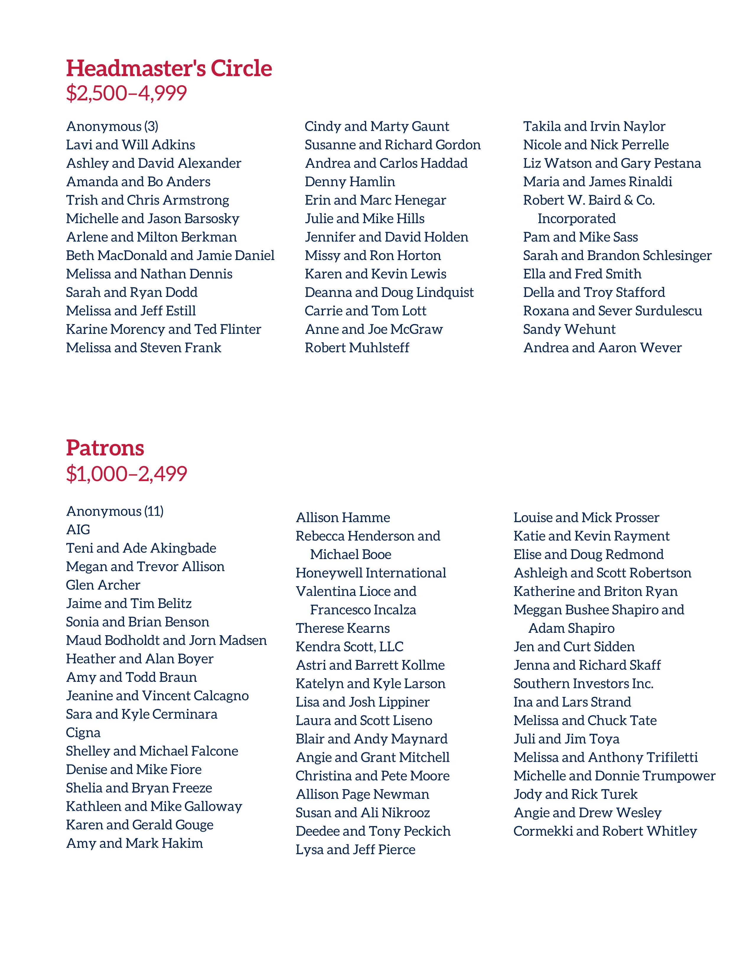 Thank you to all of the generous donors who contributed to Davidson Day's Enrichment Fund for the 2021-2022 school year. Please read our Annual Report to find out more about the Enrichment Fund, the impact of philanthropy on our campus, and for a complete list of donors.
