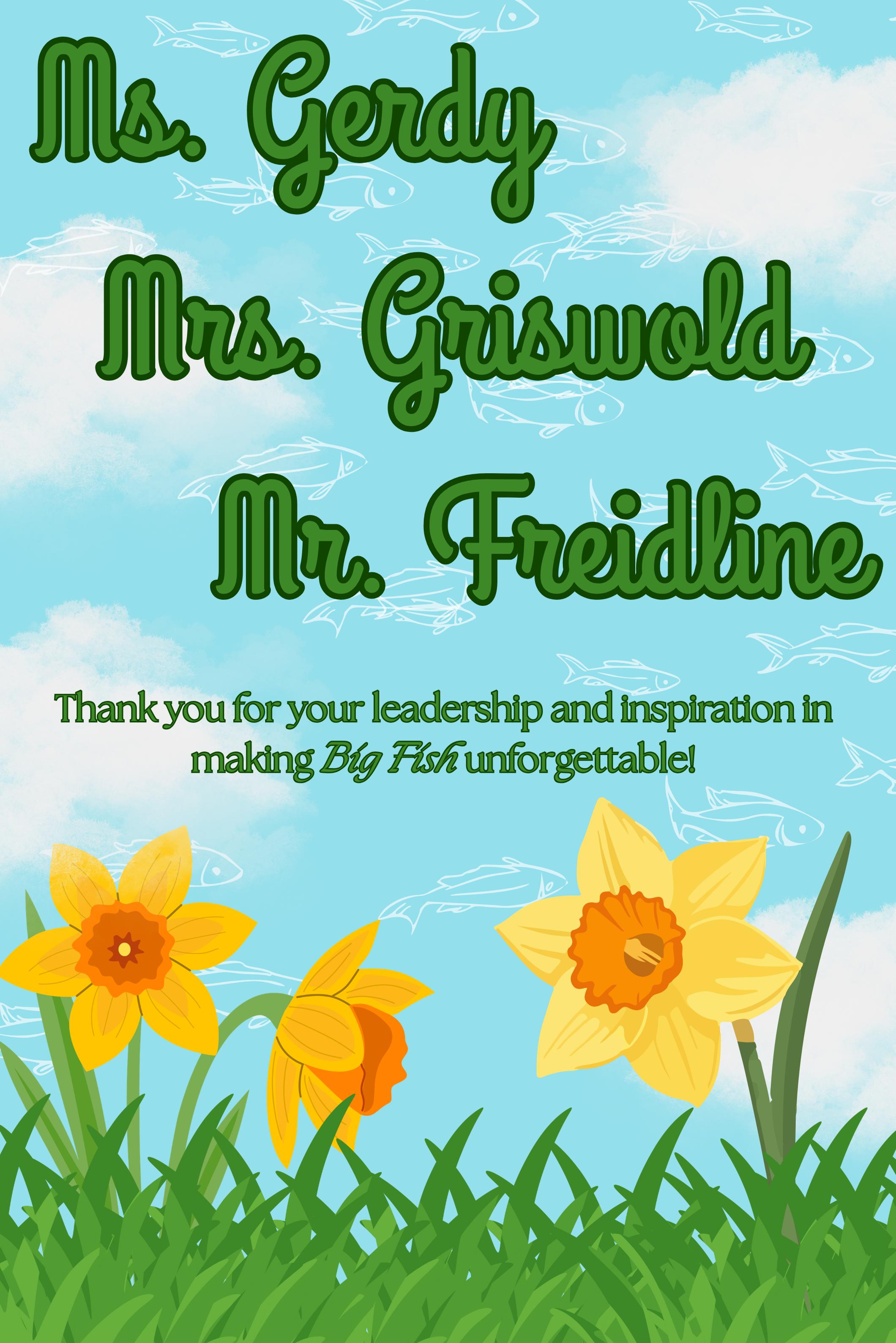 Noel Freidline for his musical genius, calming presence, willingness to step in and make things work whatever it takes, advice and technical know-how whenever I don’t know how, his windscreen gluing prowess, and for years of genuine friendship. We Can Do Hard Things!; Emily Griswold for continuing to say Yes, and for being an absolutely invaluable part of what we do here – I am so grateful for her staunch dedication to every part of the process, her spot-on collaborative spirit, myriad musical talents, for convincing me to take a day off once in a while, and for her support and friendship over the years; we make a pretty good trio; Tiffani Thomas for her mind-reading prowess, and for always being a calm and reasonable sounding board, a symbiotic co-creator, a brilliant artist, and a dear friend who I have and always will admire fiercely; Laura Woods for lending her professional photographic and photoshop skills; Angie Spraberry for letting us use the wheelchair; Kevin Julian for letting young Will read his copy of The Iliad; Tia Hill, Caitlin Barndt, Jessica Thompson, and Patience Perry for last minute prop assistance; Barbara Berry for illuminating this story with her brilliant lighting design; we are so happy to be able to bask in the magical glow she (literally) creates; Ben and Debbie Griffith for being invaluable members of this team, for stepping in and building, clearing, cleaning, supporting, and generally instilling calm into what tends to be an often chaotic process – I am in awe of your incredible talents and willingness to help us make our theatre dreams a reality – I am so grateful for everything you’ve done; Kim Lank for her positive energy, fun and easy going approach to, and handling of the creation of so many props – from human cannonball cannons, thanks to Steve Lank for helping to engineer said cannons, to dancing elephant butts, there is nothing you can’t do!; Lane Morris for intuiting what is going to make the actors shine, her steadfast “get it done” attitude on yet another Big (Fish) of a show, for literally turning tablecloths into giant pants, coming up with yet another new and different rip-away costume, for years of designing remarkable costumes with creativity and ingenuity, even more years of true friendship; Henry, for being Lane’s co-creator and number one supporter; Shawnna Pledger for lending yet another of her crazy talents - teaching Elizabeth how to walk on stilts so we could turn her into a giant; Rob Merryman, one of two Davidson Day alumni who has come back to offer his brilliant technological and troubleshooting prowess as Projection Designer; Madison Newman for helping us with some additional photography needs; Sherri Beckman and Holly Paeper for shouldering the huge responsibility of coordinating so many aspects of the production you wouldn’t know about – I would be unable to do what I do without them! Holly and Rolf Paeper for also curating and donating our show-themed concessions for countless productions; Sherri Beckman for taking on the mantel of show apparel coordinator, rock painting coordinator, and all-around kind and heartcentered supporter of all of us; Cindy Walters for the hours she commits to creating this beautiful playbill; Melissa Dennis for organizing all of the cast dinners; Caroline Ray for managing the box office; Israella Freidline for reuniting with the Davidson Day Theatre community, bringing her photographic talents and graphic artistry to the production; and Rumi – who showed up in my life exactly when I needed him – and who happens to be an awesome Assistant Director behind the scenes; Anna Montgomery and Emily McCurdy for helping find some previously unfindable costume pieces; Melissa Ohlman-Roberge, Jackie & Peter Hohenstein and Carrie Cranford / Davidson Community Players for loaning us so many props, with eternal gratitude to Chris Lundstren’s legacy; the Rodesilers for the baseball stuff; Abbie Barsosky for being a phenomenally gifted and highly organized stage manager, an equally talented performer, and one of the best people I’ve ever had the pleasure to work and create with; Megan Gray and Addison Lanter for marketing DDS Theatre - and for understanding the nature of things in general, Lisa Thomas and Suzette Watson for listening, understanding, and helping us finance DDS Theatre, Catherine Glass and Chris Turner for their unwavering arts/athletic team spirit; Dominic Barsi & Jeremy Randazza for being able – and willing - to do just about anything we ask; Davidson Day School staff, faculty, and Board of Directors for supporting live theatre , and an INCREDIBLY supportive, enthusiastic and willing band of parents who are helping to create a vibrant, professional theatre scene at Davidson Day