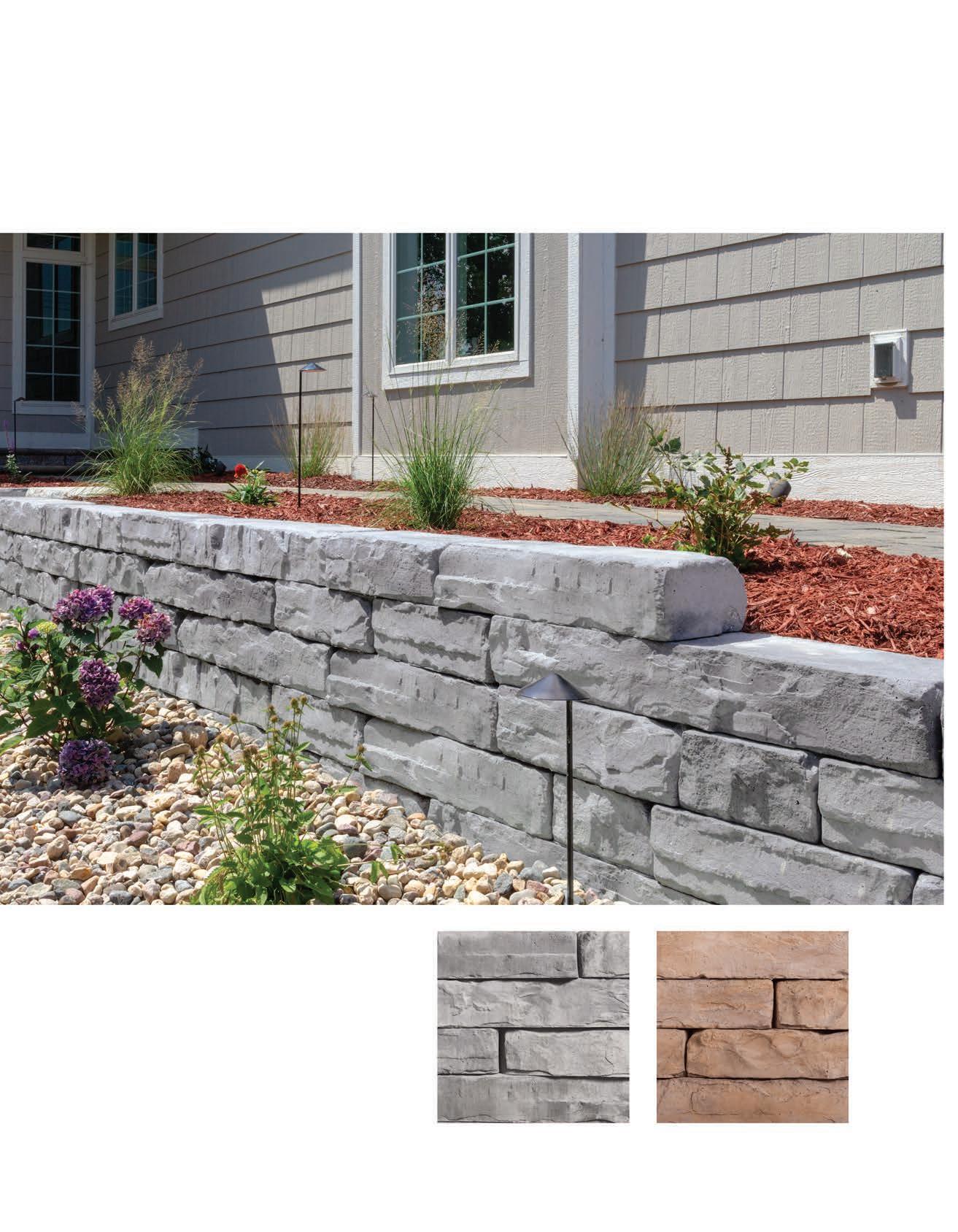 Necessories kits feature Rockwood Retaining Walls’ multi-piece, tumbled Lakeland wall block. Its linear design and aged appearance fit well in landscapes of any style or decor. Choose from three cabinet colors.