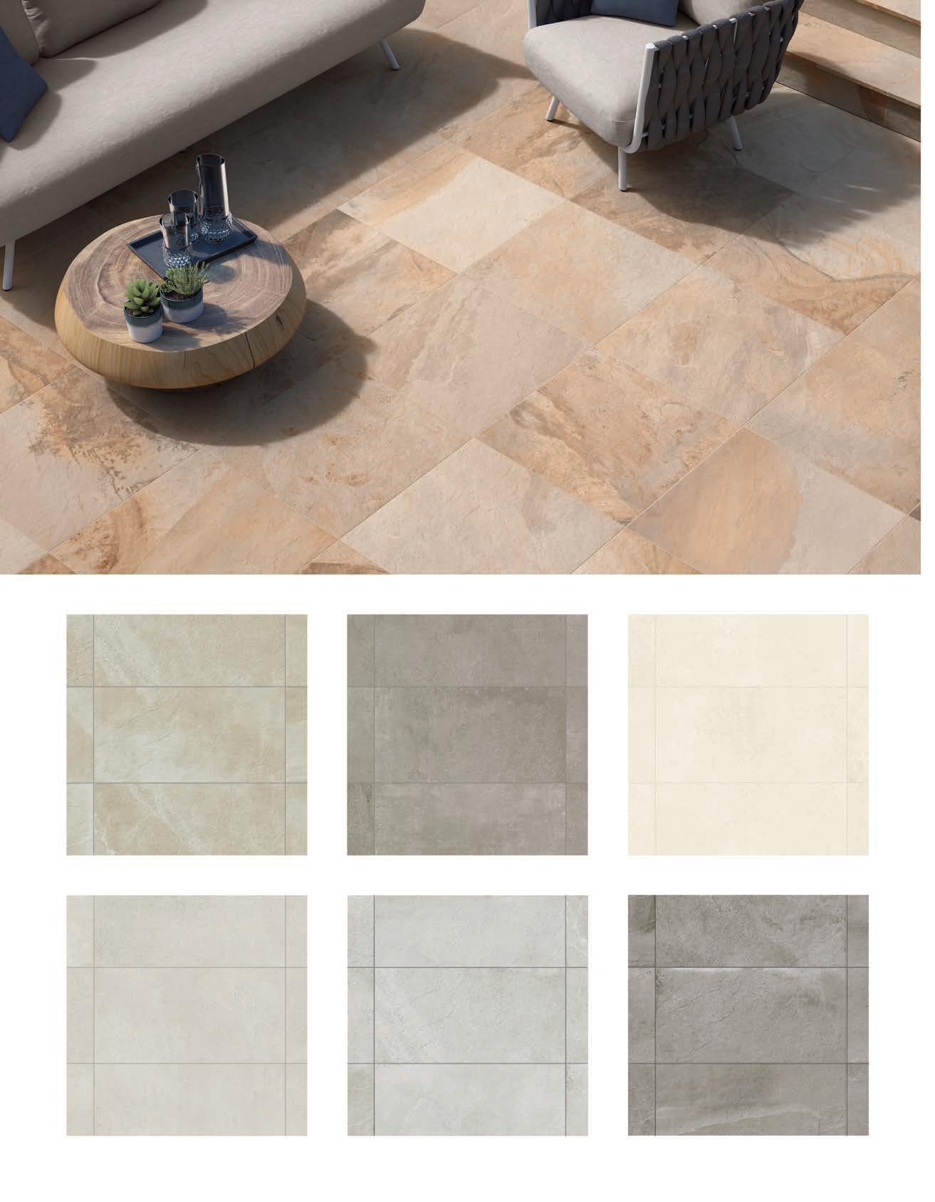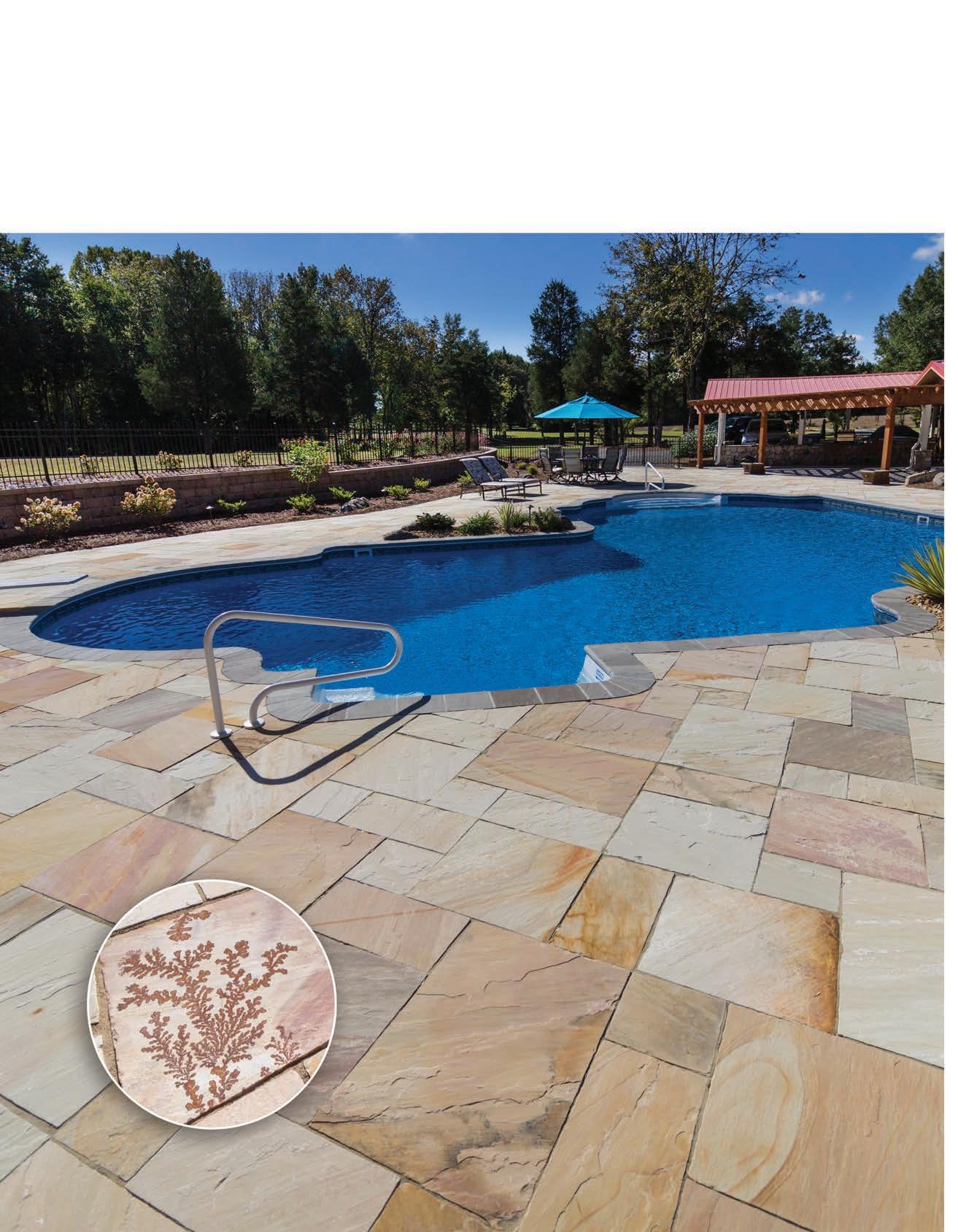 EACH FLAGSTONE IS DISTINCT, W ITH UNIQUE AND VARYING COLOR PALETTES, DIFFERING RIVEN SURFACES, NATURAL VE INING AND OCCASIONAL FOSSIL PRI NTS.