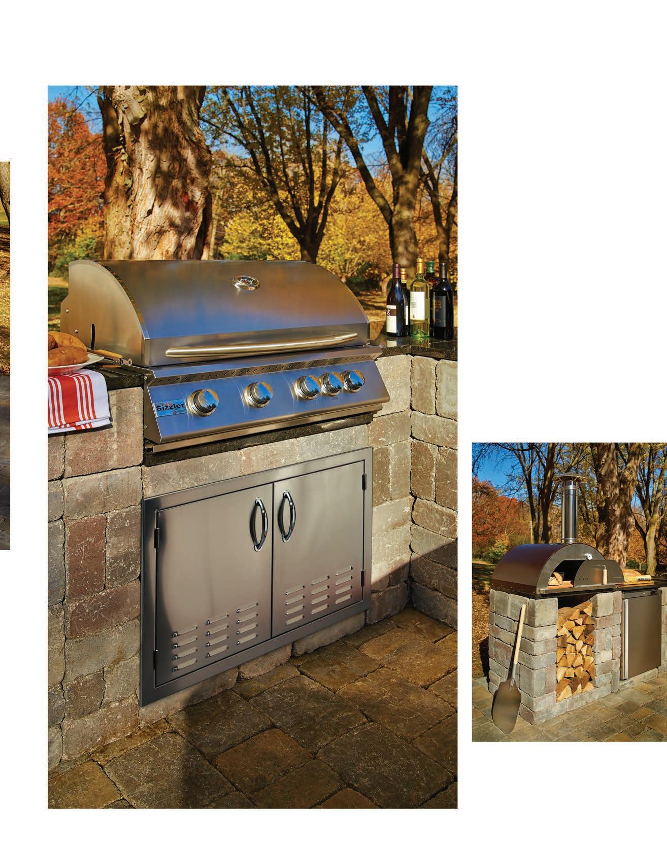 OUTDOOR LIVING KITS . . . . . . . . . . . . . . . . . . 52 COMPACT BAR . . . . . . . . . . . . . . . . . . . . . . . . . . . . . . . . . . . . . . . . . . . . . 58 DINING AND PUB TABLES . . . . . . . . . . . . . . . . . . . . . . . . . . . . . . . . . . . . . 58 FIREPLACES . . . . . . . . . . . . . . . . . . . . . . . . . . . . . . . . . . . . . . . . . . . . . . . . 54 FIRE RINGS . . . . . . . . . . . . . . . . . . . . . . . . . . . . . . . . . . . . . . . . . . . . . . . . 56 GRAND ISLAND BAR SERIES . . . . . . . . . . . . . . . . . . . . . . . . . . . . . . . . . . . 57 PILLARS . . . . . . . . . . . . . . . . . . . . . . . . . . . . . . . . . . . . . . . . . . . . . . . . . . . 59 SEATWALLS . . . . . . . . . . . . . . . . . . . . . . . . . . . . . . . . . . . . . . . . . . . . . . . . 59 WATERFALLS . . . . . . . . . . . . . . . . . . . . . . . . . . . . . . . . . . . . . . . . . . . . . . . 59 KIT DIMENSIONS . . . . . . . . . . . . . . . . . . . . . . . . . . . . . . . . . . . . . . 60 and 66 KITCHEN CABINET KITS . . . . . . . . . . . . . . 62 ISLAND CABINET . . . . . . . . . . . . . . . . . . . . . . . . . . . . . . . . . . . . . . . . . . . . 64 REFRIGERATOR AND PREP CENTER CABINETS . . . . . . . . . . . . . . . . . . . . . 64 SIZZLER GRILL CABINETS . . . . . . . . . . . . . . . . . . . . . . . . . . . . . . . . . . . . . 63 SMOKER, SIDE BURNER, STORAGE AND CORNER CABINETS . . . . . . . . . 65 WOODBOX/STAND . . . . . . . . . . . . . . . . . . . . . . . . . . . . . . . . . . . . . . . . . . . 63 ACCESSORIES CHISELED CAPS & TOPS . . . . . . . . . . . . . . . . . . . . . . . . . . . . . . . . . . . . . . 48 CHISELED STEPS . . . . . . . . . . . . . . . . . . . . . . . . . . . . . . . . . . . . . . . . . . . . 53 SANDS, SEALERS AND CLEANERS (PROTECT YOUR INVESTMENT) . . . . . 67 WET CAST STEPS . . . . . . . . . . . . . . . . . . . . . . . . . . . . . . . . . . . . . . . . . . . . 50 3