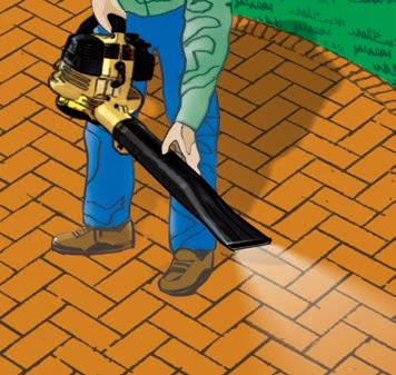 Using a fine bristle broom or leaf blower, remove any excess polymeric sand from paver’s surface (without displacing the polymeric sand between the pavers).