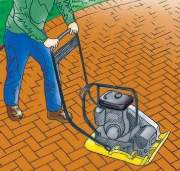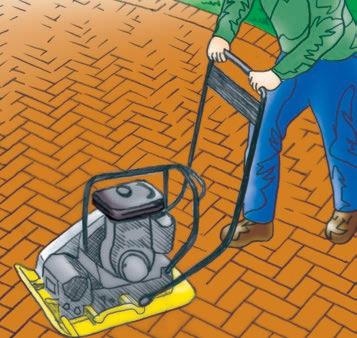 Sweep off the surface completely and use the plate compactor to tamp the pavers to a uniform level. Run the compactor in a parallel direction across the pavers, overlapping on each pass. Make a second series of passes in a perpendicular direction. Important: for large profile pavers or a raised surface paver, set compactor to half speed and use a uni-saver matt.