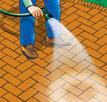 Follow manufacturers application instructions when activating polymeric sand. Define your working surfaces into 200 sq. ft. areas. Using the shower setting on garden hose sprayer, wet the first 200 sq. ft. area for 30 seconds (without displacing polymeric sand).