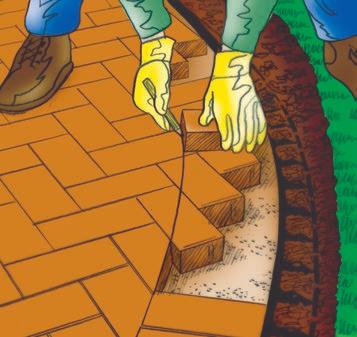 Many of the pavers that butt into the soldier course (strip of pavers all facing in the same direction) will need to be cut to fit properly. Using a concrete saw or guillotine splitter, cut each paver separately – marking it, removing it, cutting it and placing it – before proceeding to the next one. Always wear safety glasses when cutting pavers. Install the soldier course as you go along.