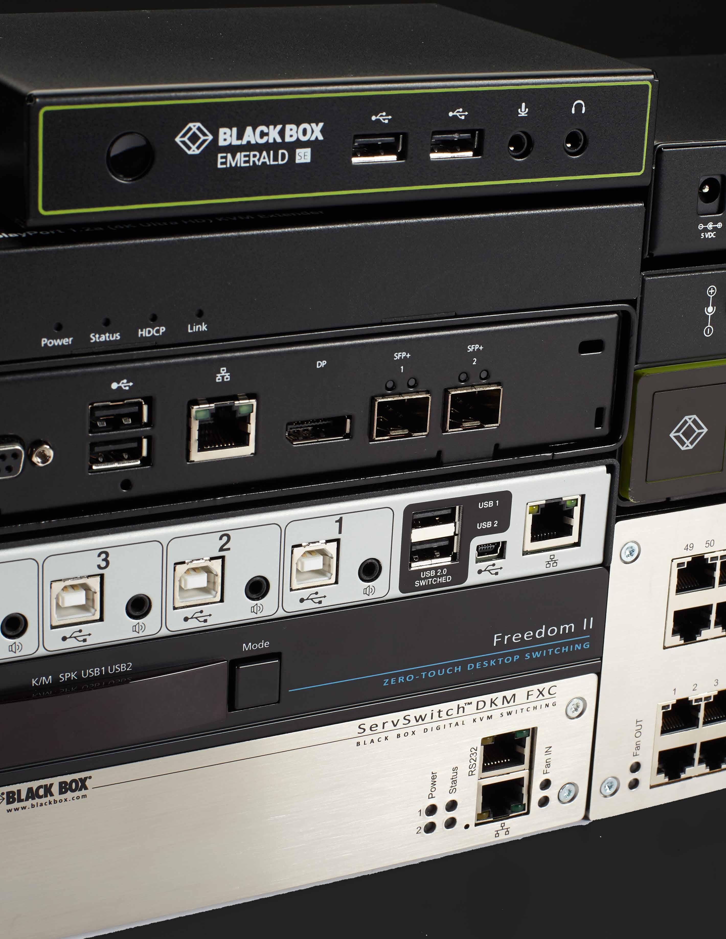 Black Box® has developed and manufactured industry-leading KVM technology for over 25 years. Today, Black Box has become the global leader in KVM in terms of KVM product range, revenue, employees and global coverage. The broad portfolio of KVM products allows you to build a complete solution that fully benefits your application. Our team of technical experts can help you choose high-quality KVM extenders, KVM switches, networking components, AV equipment, and accessories for your solution. From the desktop and data centre to medical environments and mission-critical control rooms, we will help your team simplify IT administrator and operator processes, improve workflows and increase productivity.