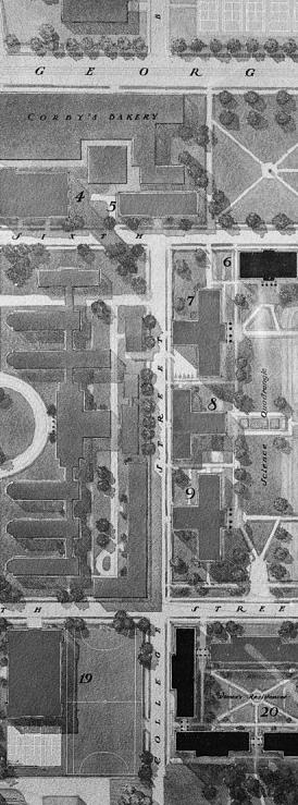 Howard University site section showing main campus and Founders Library, drawing by Albert Cassell (HU MSRC), p. 96–97