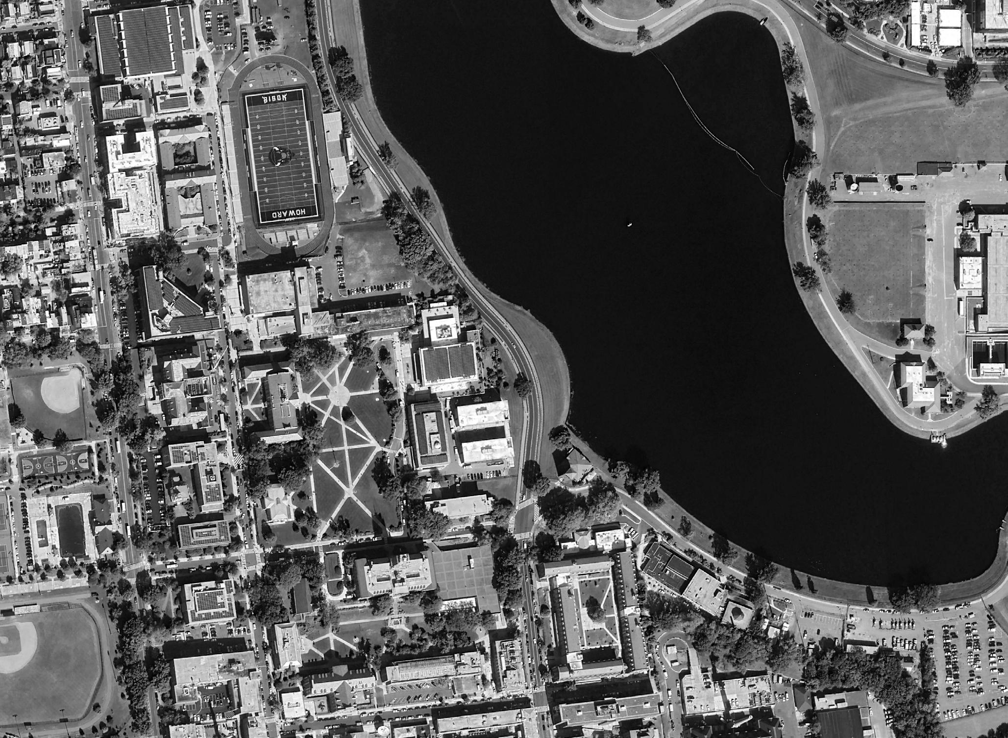 Opposite: Howard University campus and reservoir with Douglass Hall site outlined in white, circa 2025