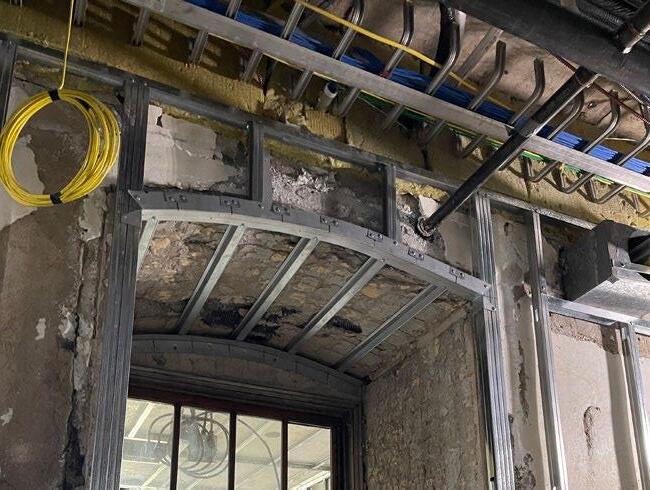 After demolition exposed a long-forgotten plaster ceiling above a warren of old offices, the team brought in skilled artisans trained in traditional plasterwork. Using time-honored methods and custom tools, the team recreated the original etched patterns by hand, a craft that has become increasingly rare in modern construction. Though not entirely lost, such expertise is practiced by only a small community of specialists committed to historic preservation.