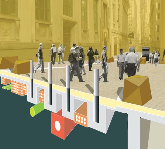 streetscape vision needs to address a range of experience and how the neighborhood can be enlivened. Different times of day and days of the week may also present different opportunities for activities such as weekend greenmarkets that could take advantage of a lull in the commercial use of Greenwich Street or weekday events that cater to office workers on lunch breaks and after work. The close proximity of Hudson Square to the Hudson River is another theme to be explored, as is the use of heavy urban infrastructure for pedestrian recreational uses.