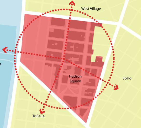 The identity of a city is collective, based on the contributions, experiences and activities of residents and visitors. Individual contributions, ideas, designs, and dreams form a symbiotic relationship with the city; they coalesce into a singular creation. This same communal principle applies to each neighborhood within the city, with each individual, distinctive unit contributing to the character of the larger city. Hudson Square embodies this integrated urban experience of New York–busy pedestrian sidewalks, quiet side streets, gridlocked avenues which block crosstown traffic, a vibrant night life, disaggregated retail, isolated parks, sidewalk food carts, and pop-up art installations on forgotten walls and recesses. Hudson Square has it all and is ripe for a renaissance.