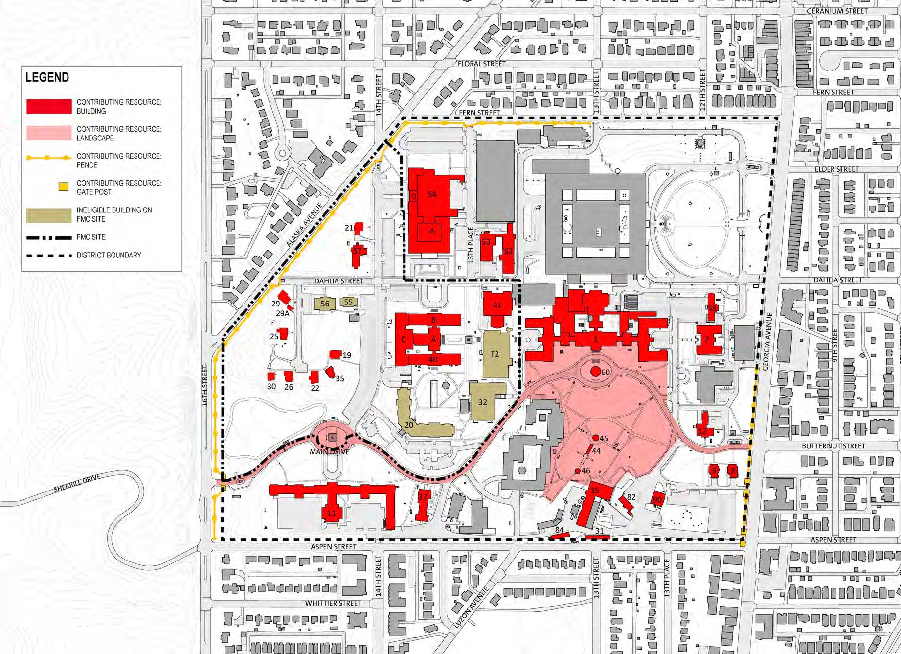 Located near the northern apex of the District of Columbia, the WRAMC has a long history and, consequently, any plans and studies need to take into consideration the historic context. The entire WRAMC campus is listed on the National Register of Historic Places and DC Inventory of Historic Sites as a historic district. The period of significance for the historic district is July 11 to 12, 1864 and 1909 to 1956. Any extant structure constructed between 1909 and 1956, the period of significance related to the WRAMC period, is considered a contributing resource. As a historic district all proposed projects within the boundaries will be subject to review following the local historic preservation requirements and guidelines.