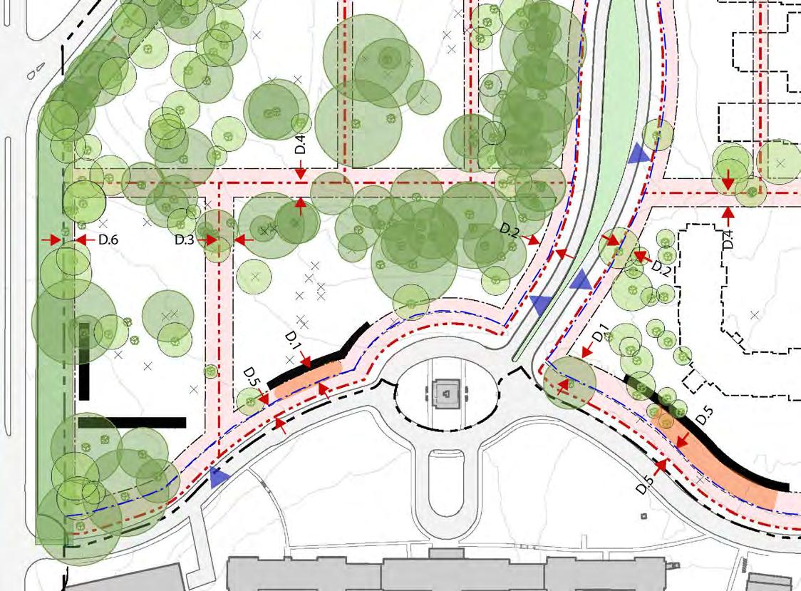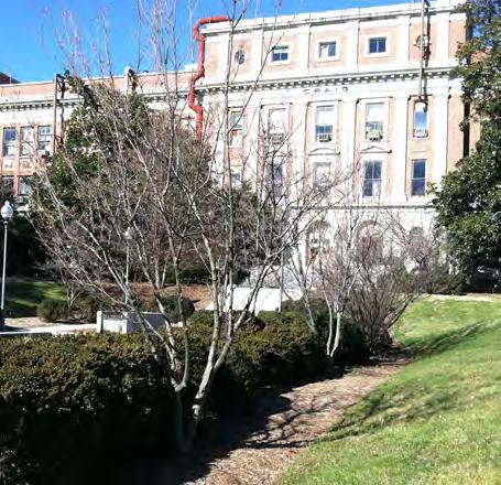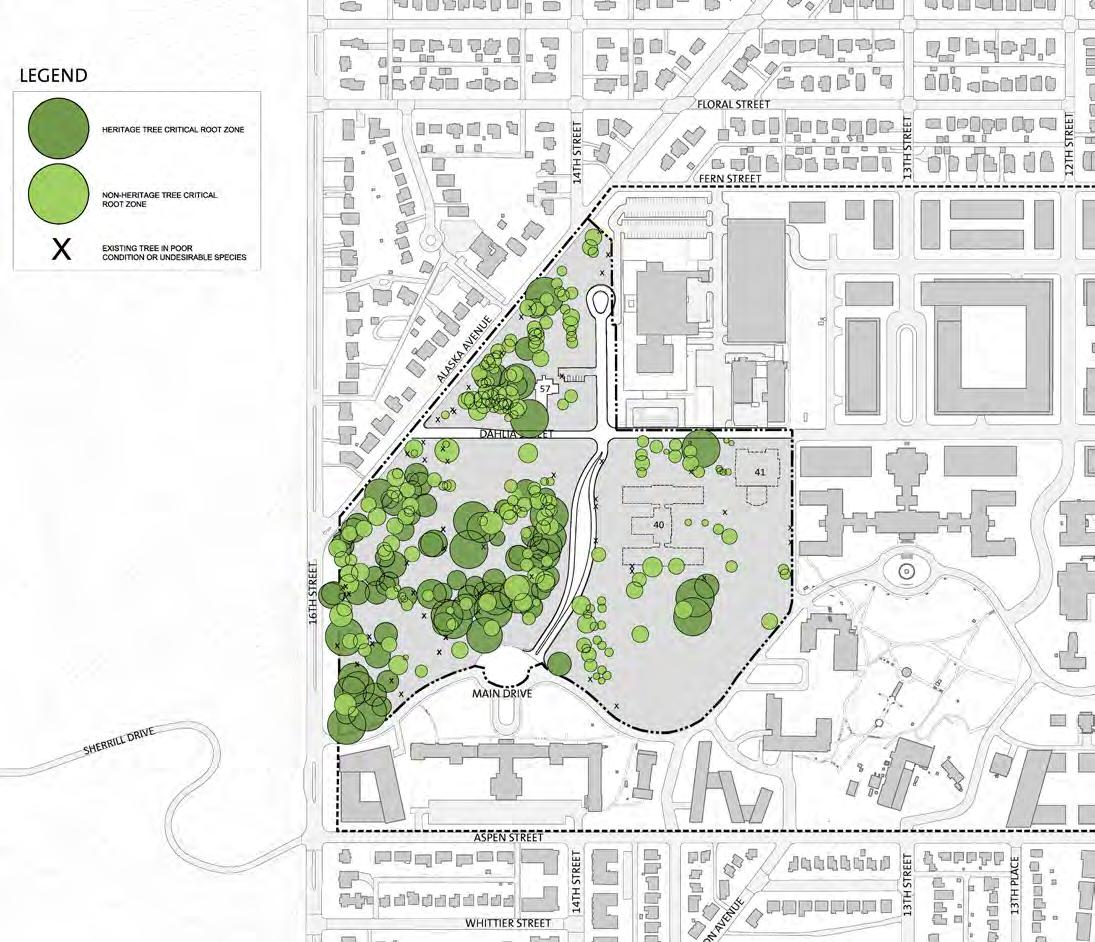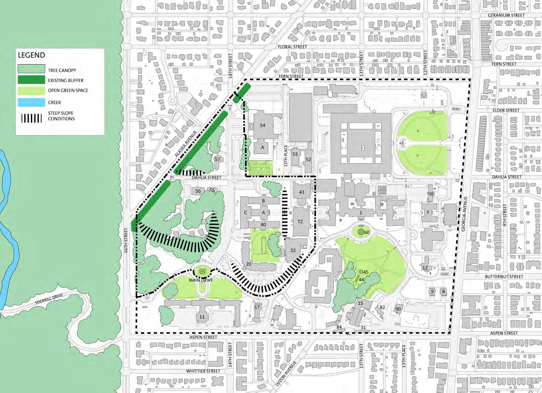 The character of the campus divides along 14th Street, with a more cultivated landscape to the east and a more forested landscape character to the west. The landscape east of 14th Street is characterized by man-made features such as formal gardens, avenue of trees, and built elements in the landscape. The landscape west of 14th Street is characterized by the predominantly native species tree canopy, reinforced by several areas with steeper slopes. The Design Guidelines will reinforce the juxtaposition of these two landscapes.