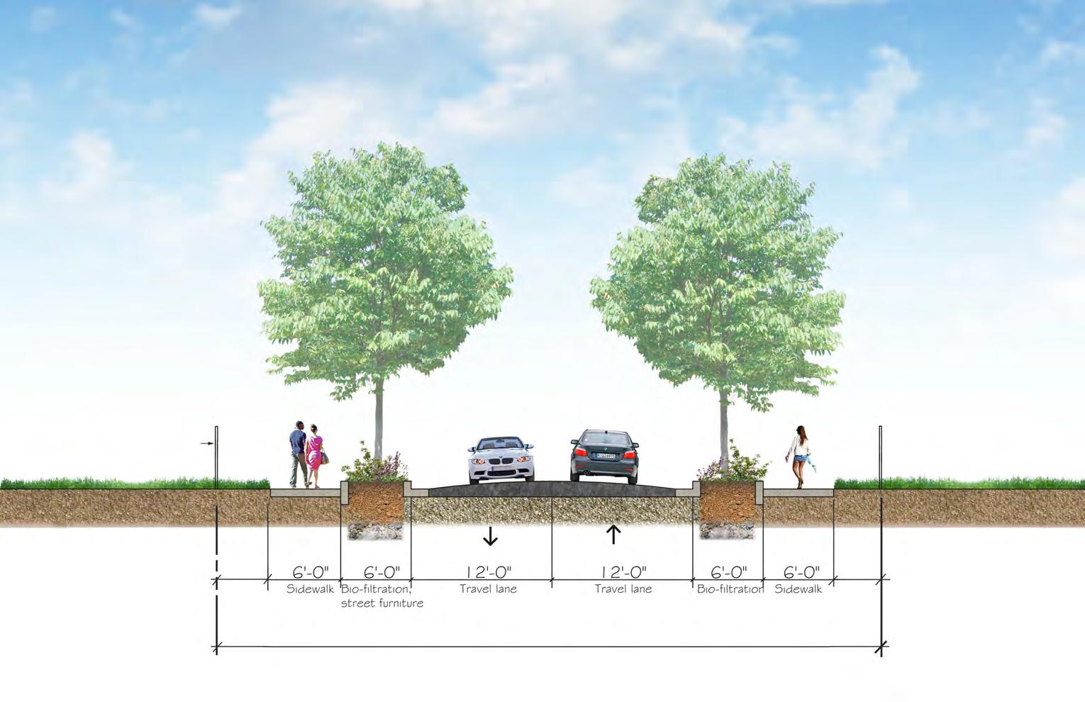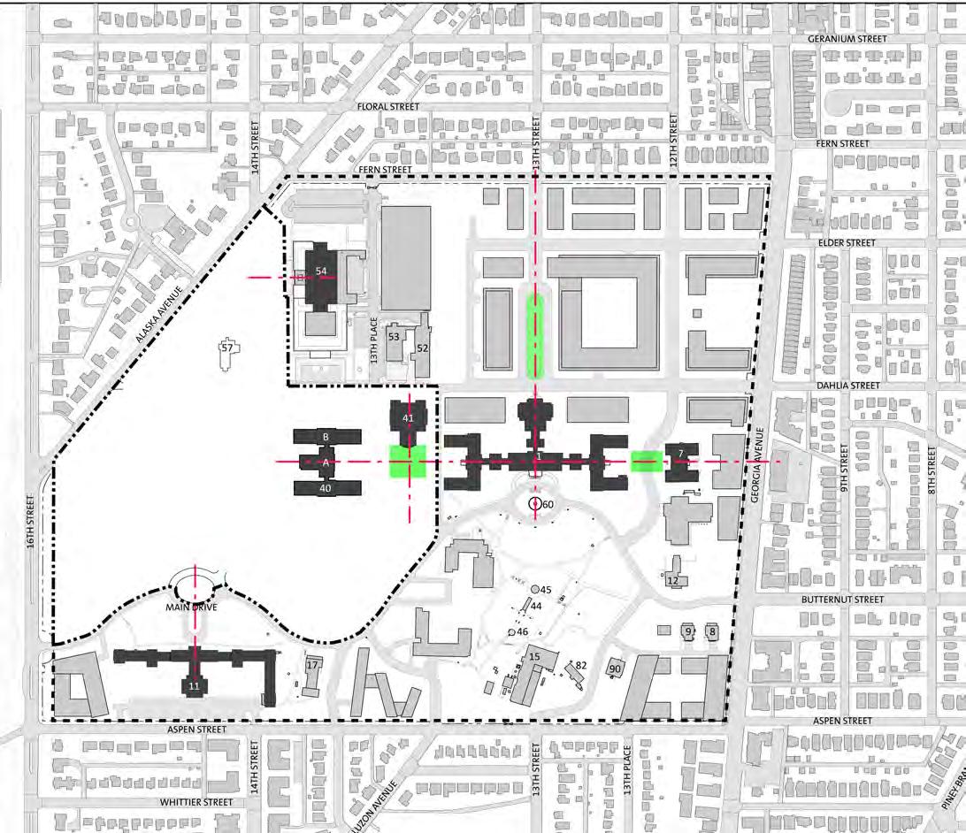 The vision for the FMC master plan is a contextual response to the city fabric around the site, the Walter Reed Local Redevelopment Authority (DCLRA) master plan, Children’s National Medical Center (CNMC) master plan, reinforcement of the existing cultural and natural landscapes, reuse of key historic structures and respectful of existing axial relationships. A simple and clear network of streets and open spaces transforms the proposed redevelopment by DOS, CNMC, and District of Columbia of the WRAMC into a unified, holistic plan poised to become a signature Washington, D.C. neighborhood within the 21st century. The east and west halves of the campus are sewn together with the clear definition of Dahlia Street as a boulevard adding connectivity and a sense of vibrancy between the DC-LRA portion and the FMC portion of the WRAMC campus. The primary entrance for the FMC on Main Drive is defined by the existing ellipse to the south but given further credence through the linear northsouth greenway, culminating in a park surrounding the historic Memorial Chapel on the north side of campus. This greenway serves as an amenity to the master plan but also has a practical purpose as a bio-retention park, managing a portion of the rain water run-off (storm water management plan) on the campus. There are four site-wide themes that provide the basis for the master plan concept.