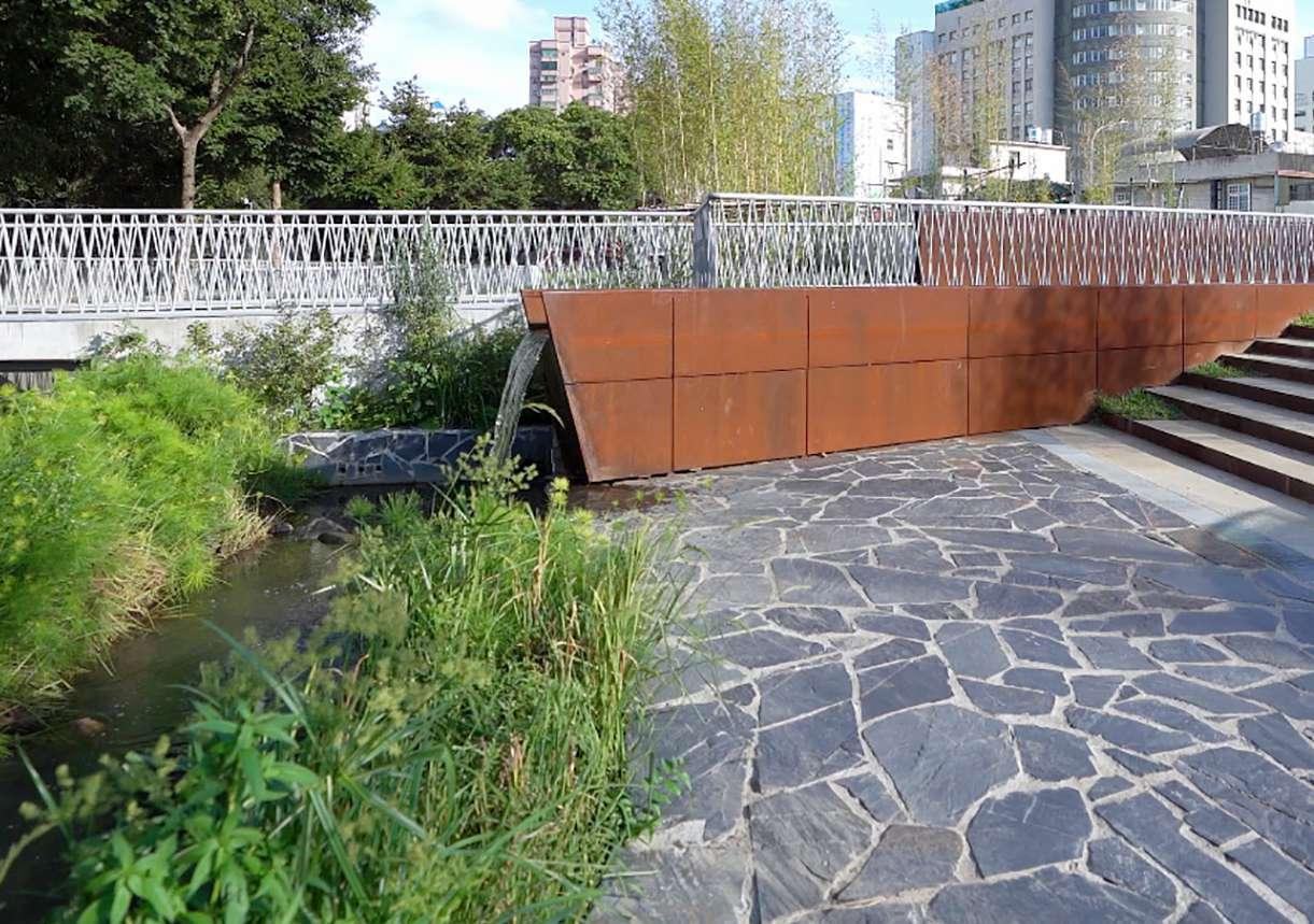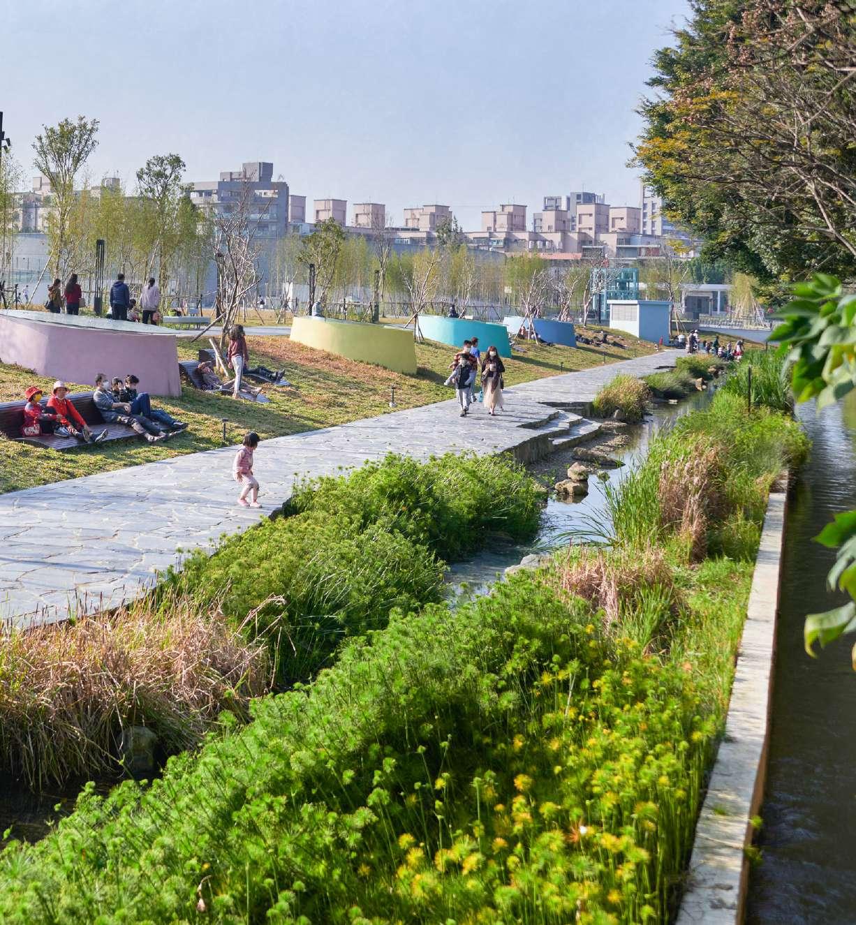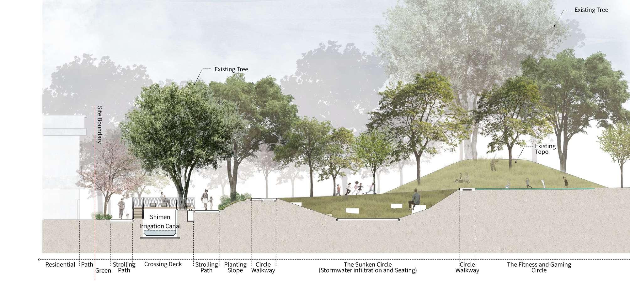 石門大圳過領分渠流過大半基地邊緣,因受限水利要求無法直接將 溝壁生態化,本設計降低水渠壁體高度,在東側地塊於上游將水抽 取至公園,延展出一段自然流水後再流回水渠,在公園境內營造生 態環境,吸引昆蟲、鳥類飛旋,提供市民可以親近自然的機會;西 側地塊鄰接高密度之鄰里房舍,則將水渠兩側連通環境改善,置入 休憩平台,讓過往被視為生活背面的巷弄翻轉為正面、擁抱開闊的 公園。流過基地邊緣的水渠如同縫線,透過柔軟的環境改造手法讓 周邊學校、社區鄰里與公園關係更緊密。
